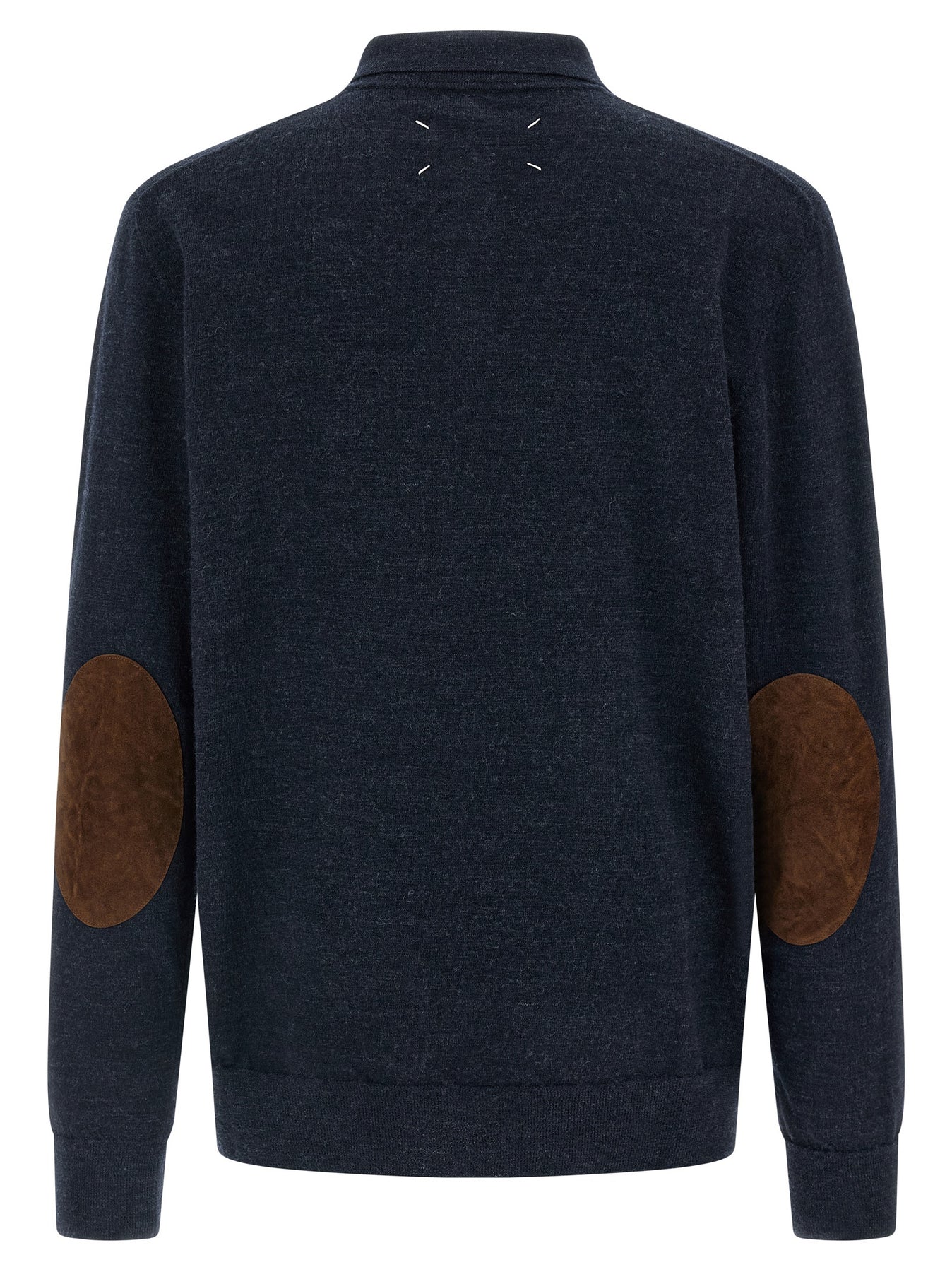 Wool polo shirt, collar and buttons, long cuffed sleeves, suede elbow patch, 'Four stitches' at the back.