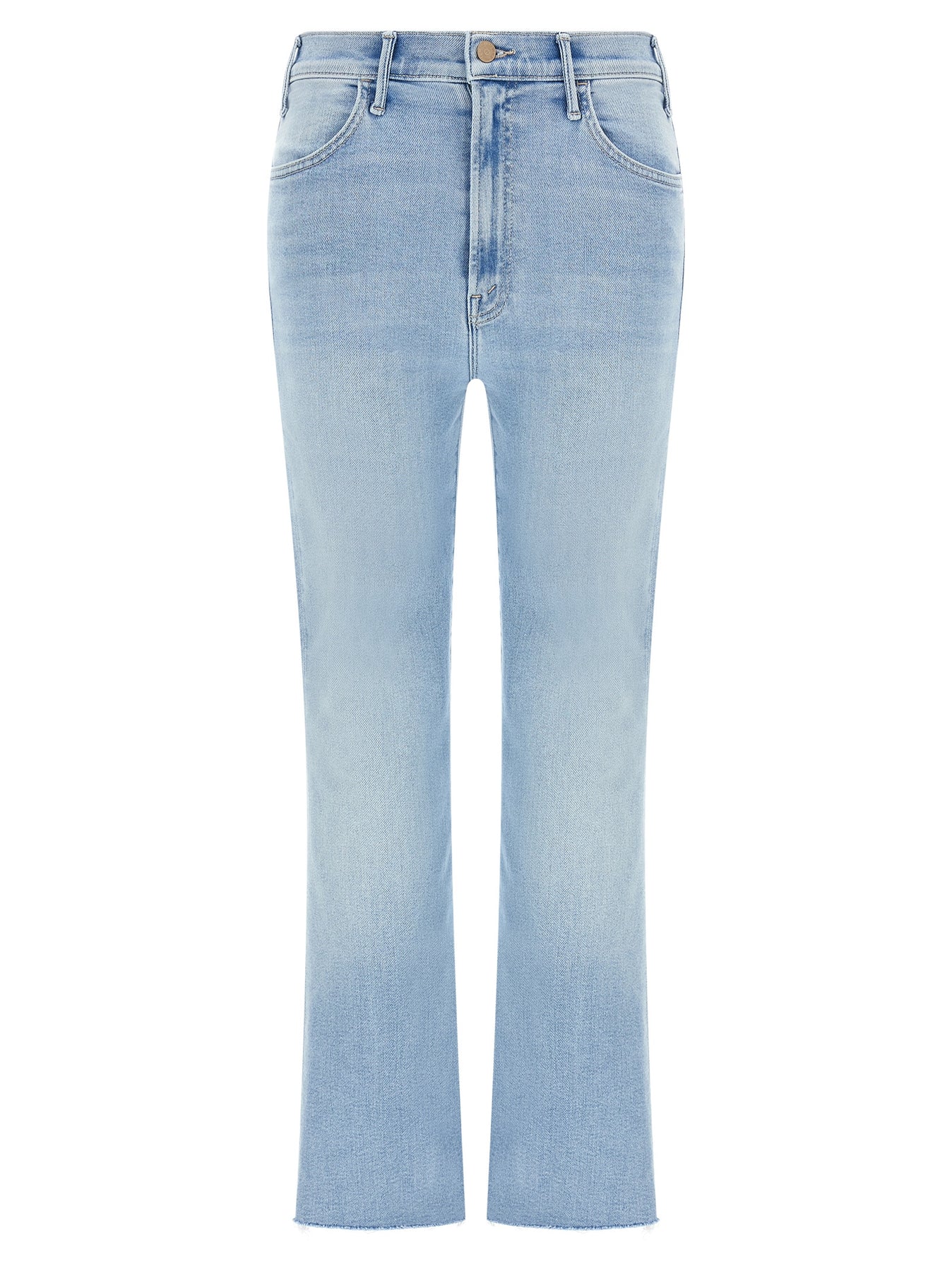 'The Hustler Ankle Fray' denim jeans with zip and button closure, tone-on-tone logo embroidery on the back pockets and frayed leg hem.