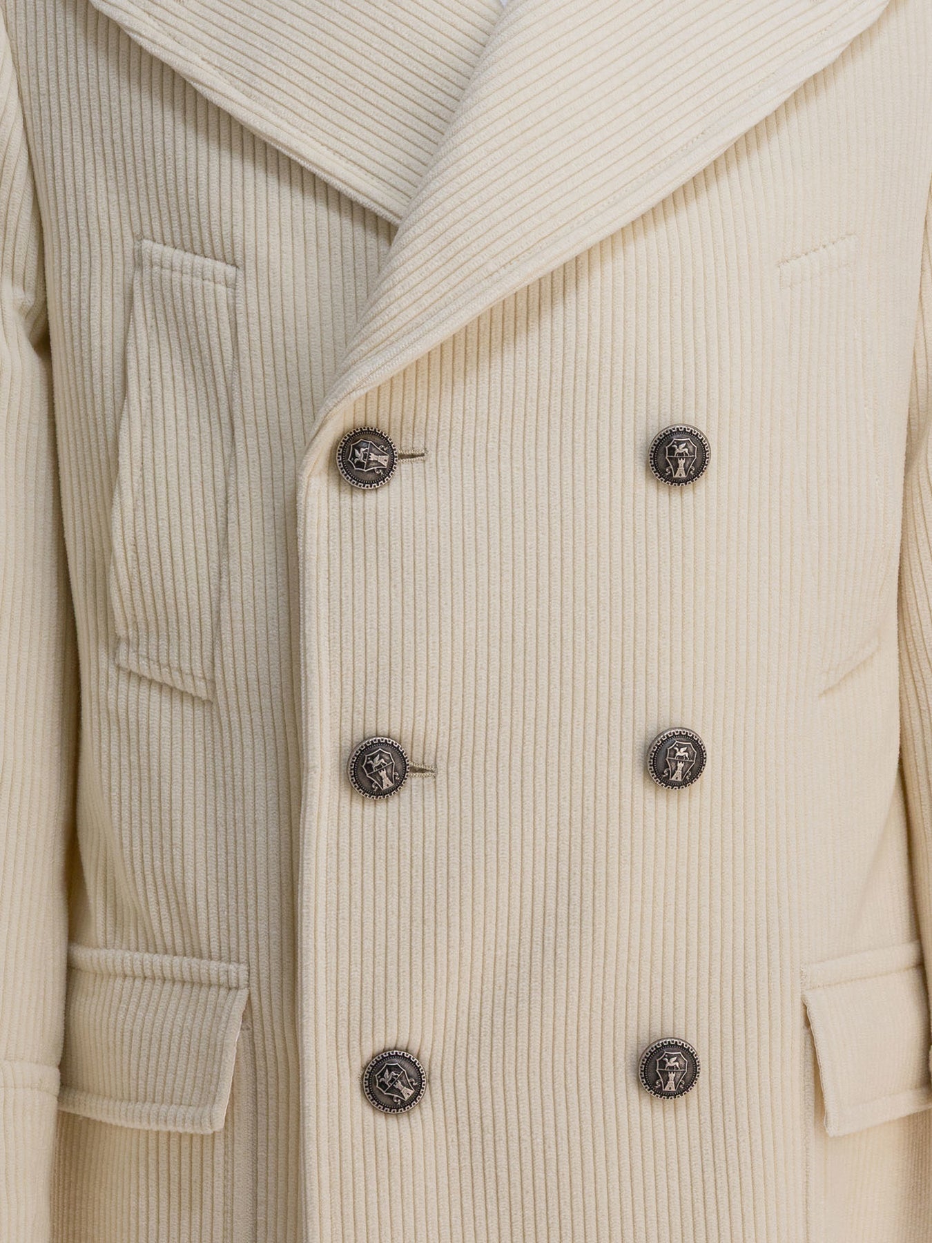 Brunello Cucinelli velvet coat, one-and-a-half-breasted construction, made of wide-ribbed velvet. Cashmere fibers are integrated into the weave, giving the fabric a soft hand. Spear lapels and straight-cut construction, with six metal buttons arranged in front. The silhouette features regular volumes designed to ensure comfort while wearing. || - Solid color - Long sleeves - One and a half breasts - Six metal buttons - Wide-ribbed velvet fabric with cashmere fibers - Regular fit