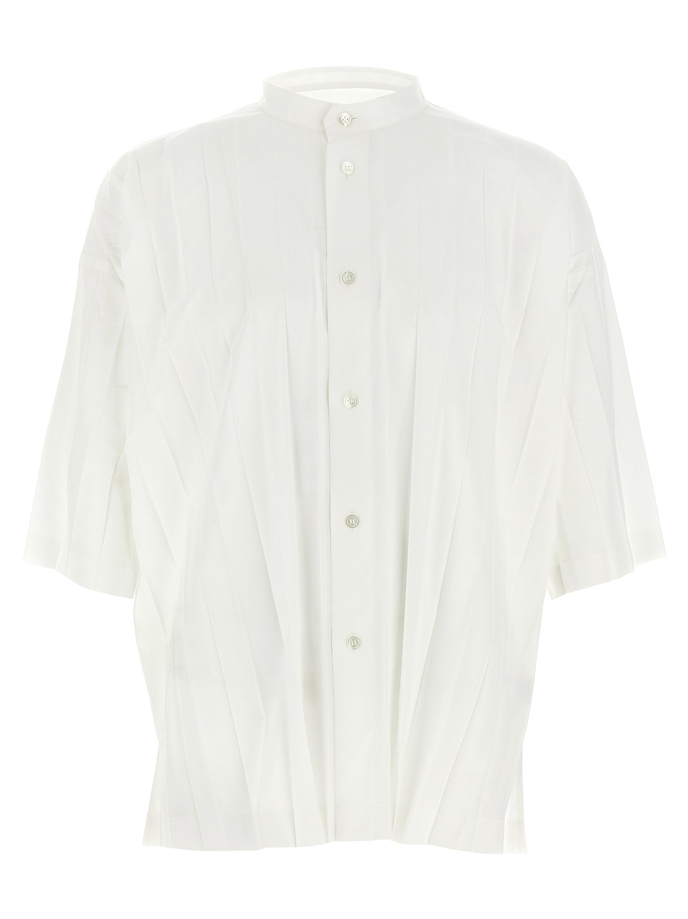 'Edge Shirt' pleated shirt with collar, front button closure, short sleeves.