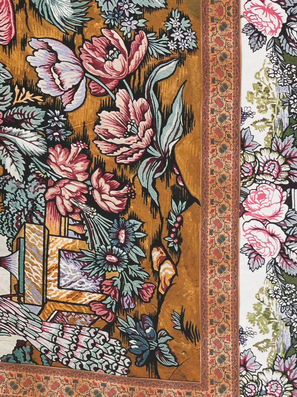 beige floral print fringed edge peacock motif