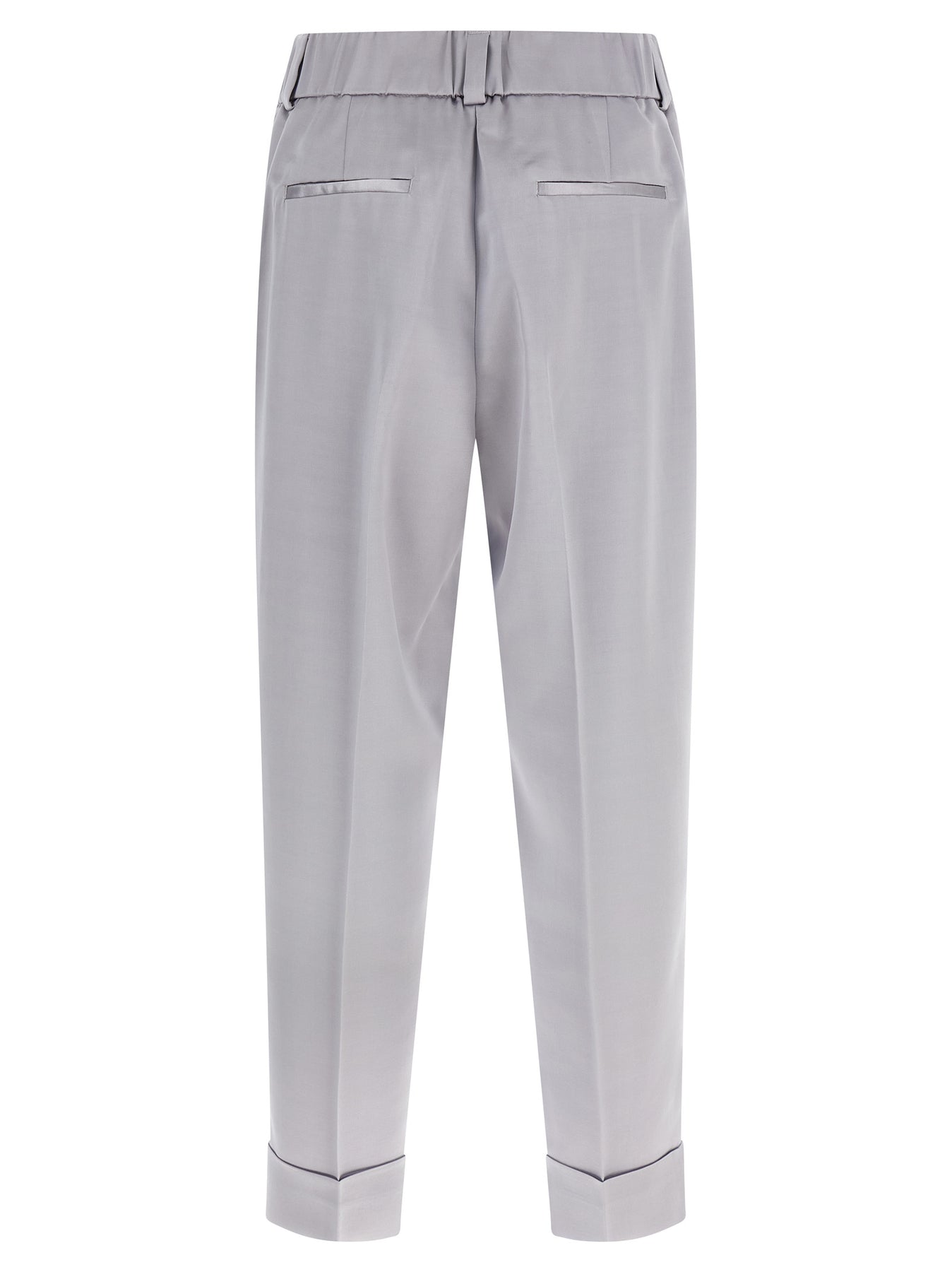 Crop-length pants in fluid viscose and wool satin, pleated, pressed crease, front zip, hook and button closure, pockets, turn-ups at the bottom of the legs.