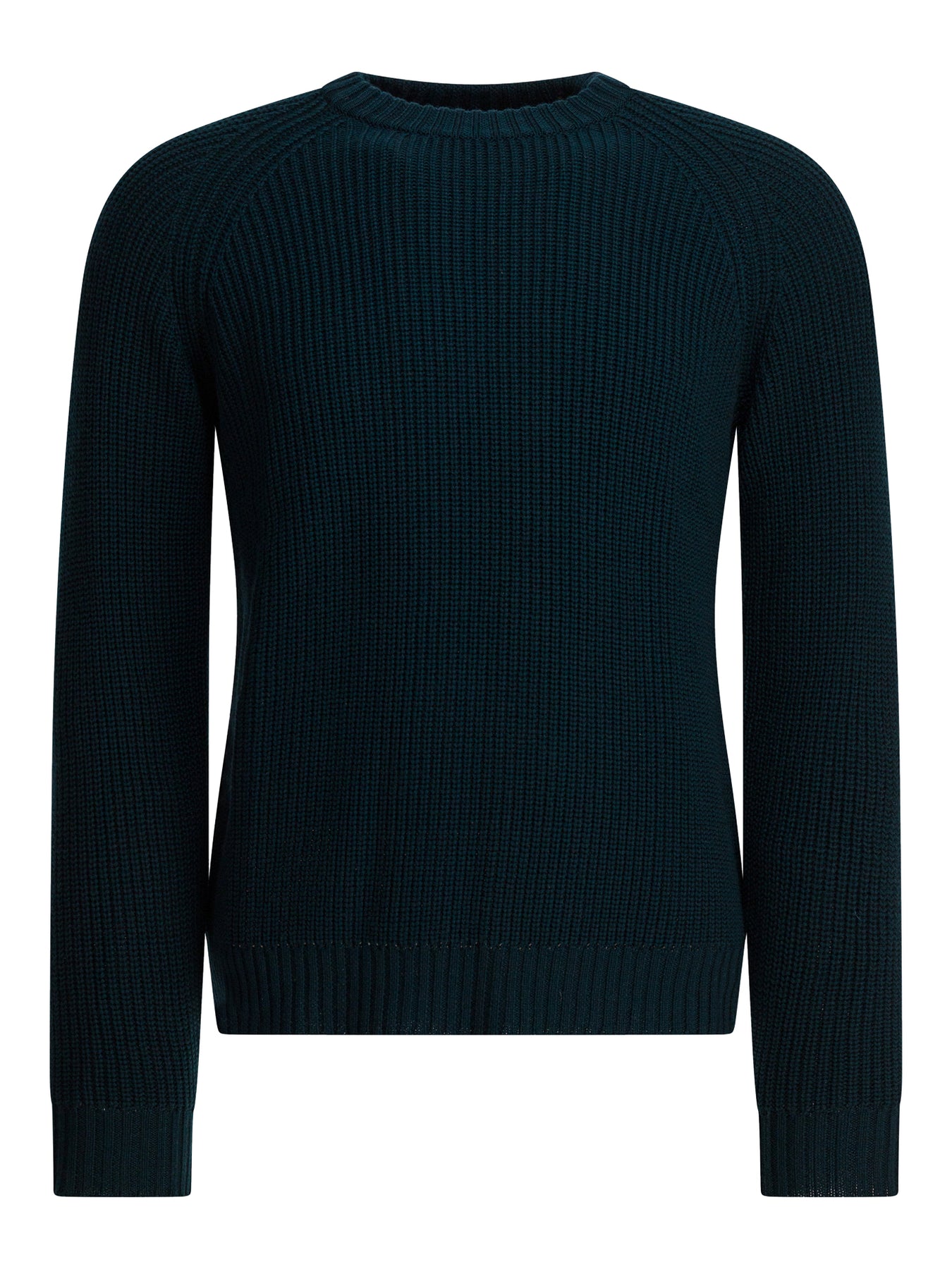 Rakkì "Rebel" crew-neck sweater, made of compactly knitted English stitch operated fabric. Construction with raglan shoulder that follows the profile of the shoulder, dense and uniform knit structure. The bottom of the jacket and cuffs feature cannolé work for added shape stability. The cut is direct, the silhouette is basic with regular profile that does not cling to the body. || - Solid color - Long sleeves - Raglan shoulder - Textured fabric in English stitch - Cannolis on bottom hem and cuffs - James Dean 1955 inspired pattern - Regular fit