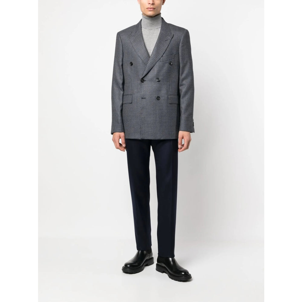 navy blue virgin wool/cotton tailored design pressed crease straight leg mid-rise belt loops concealed fly and button fastening two rear button-fastening jetted pockets full lining