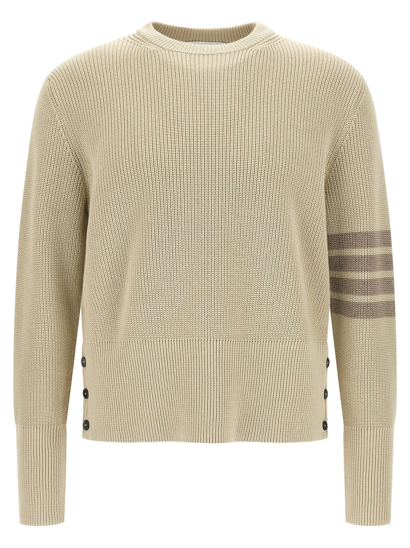 Knitted cotton sweater with 'RWB' grosgrain tape details, crew neck, long sleeves with '4BAR' and button cuffs, side slits with buttons.