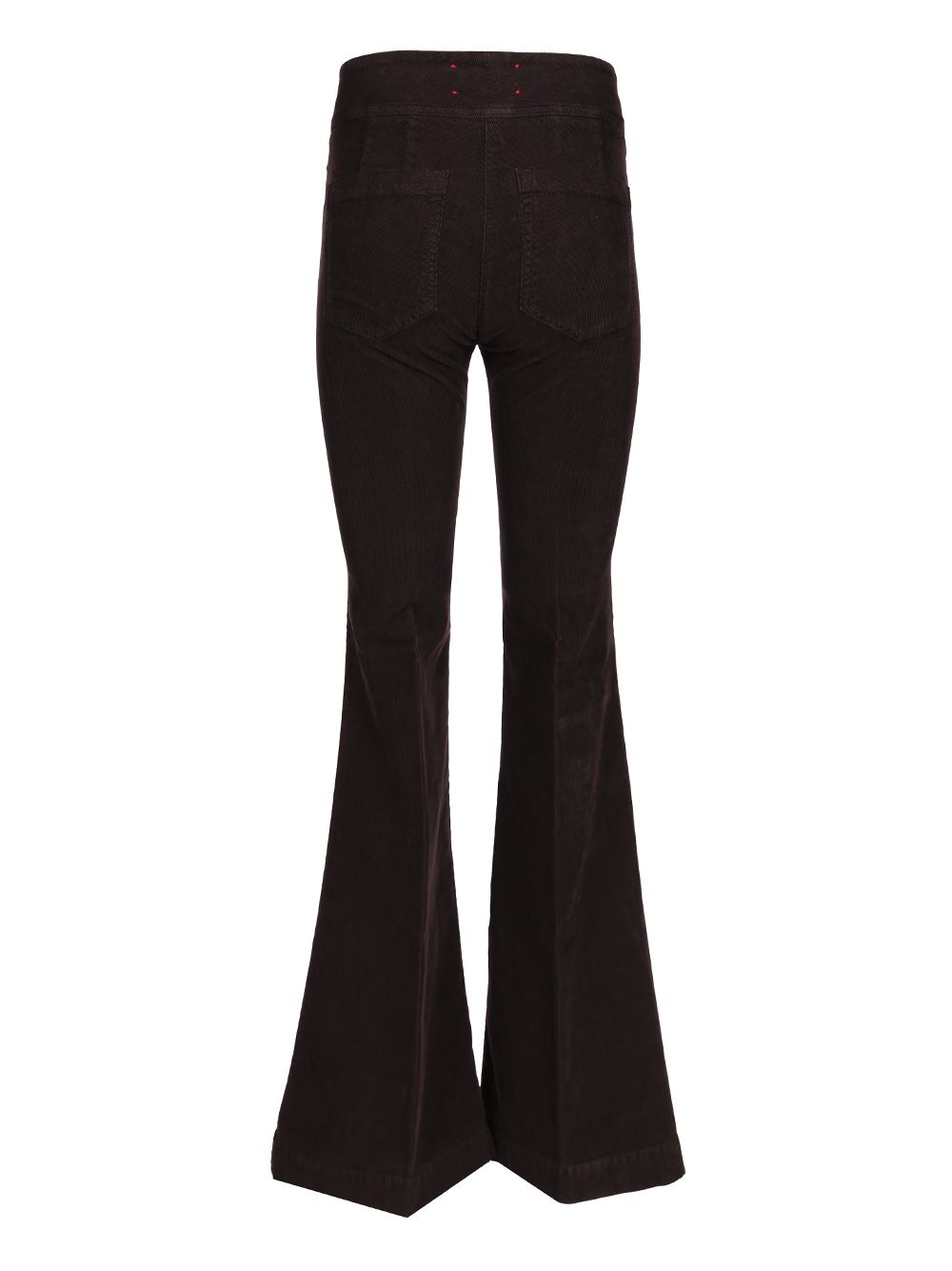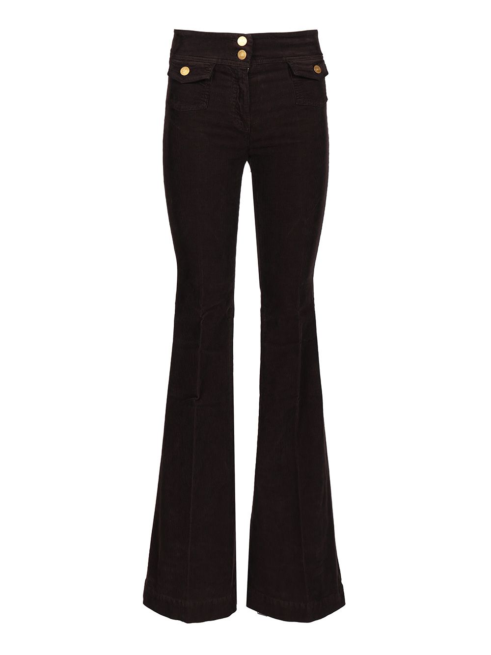 flared jean with two back pockets and two front flap details (mock pockets) with buttons. Two front flap details. Stretch fabric.