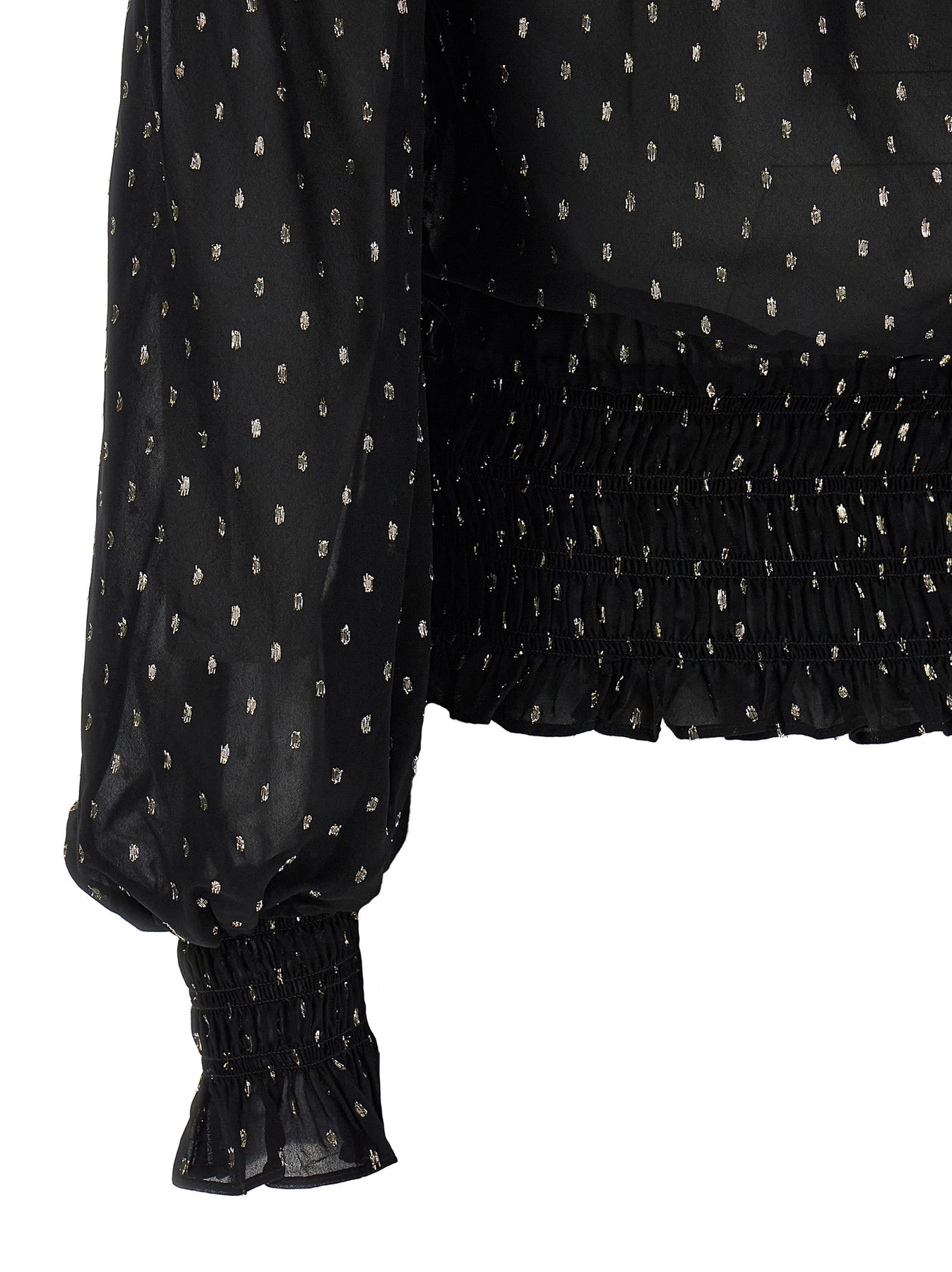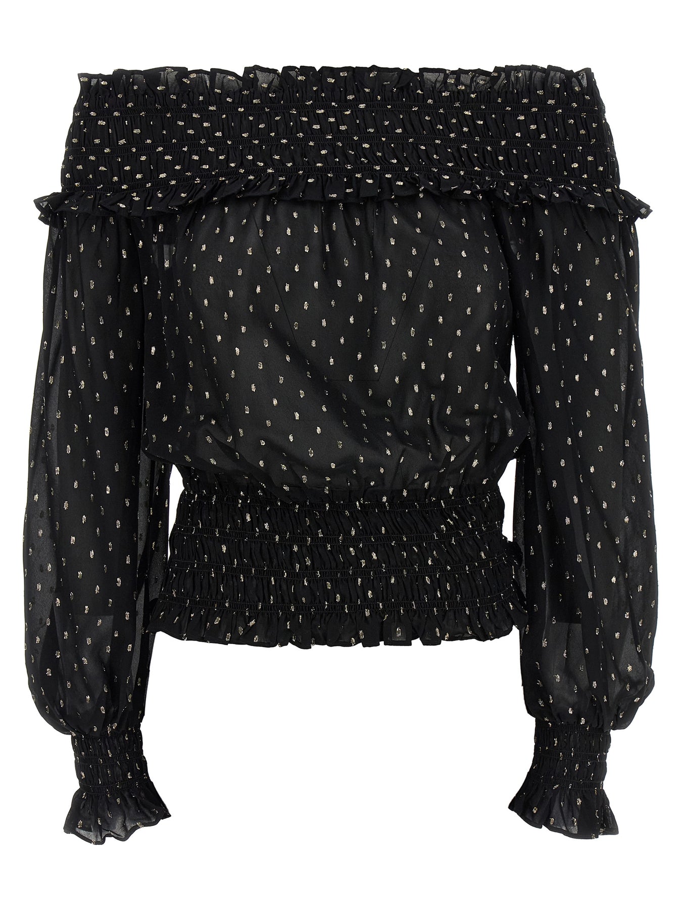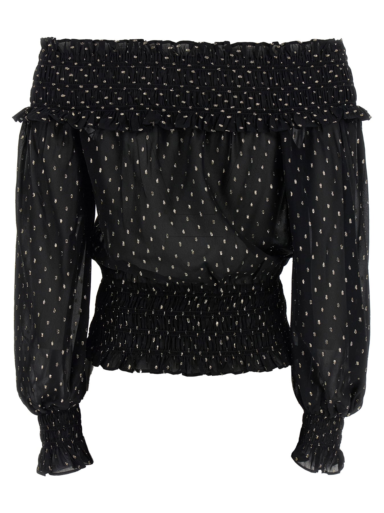 'Black And Gold Chiffon' metallic fil coupé top, off-the-shoulder model with upper smock stitch, on the hem and in the cuffs, flounces, long sleeves with cuffs.