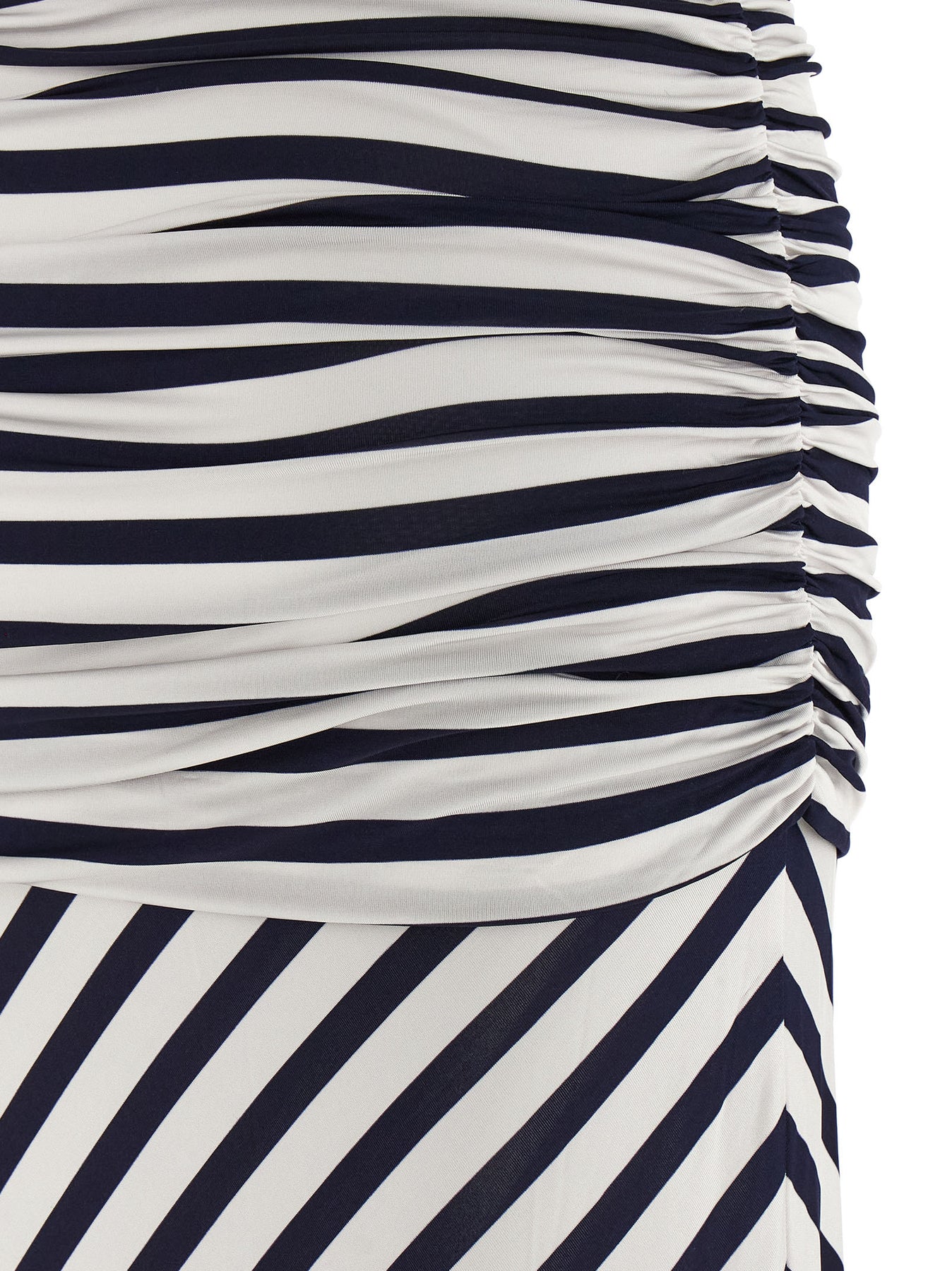 'Navy Stripe Jersey Maxi' striped shiny stretch viscose jersey dress, wide front and back draping at the waist, mermaid skirt, short sleeves, high neck.