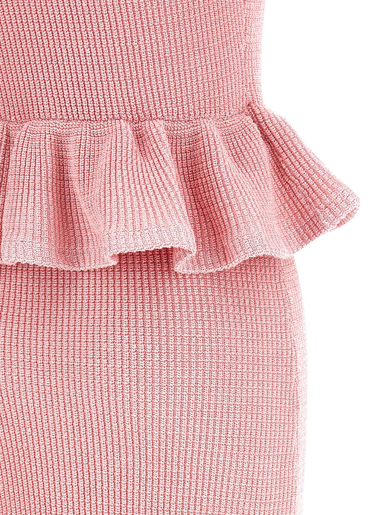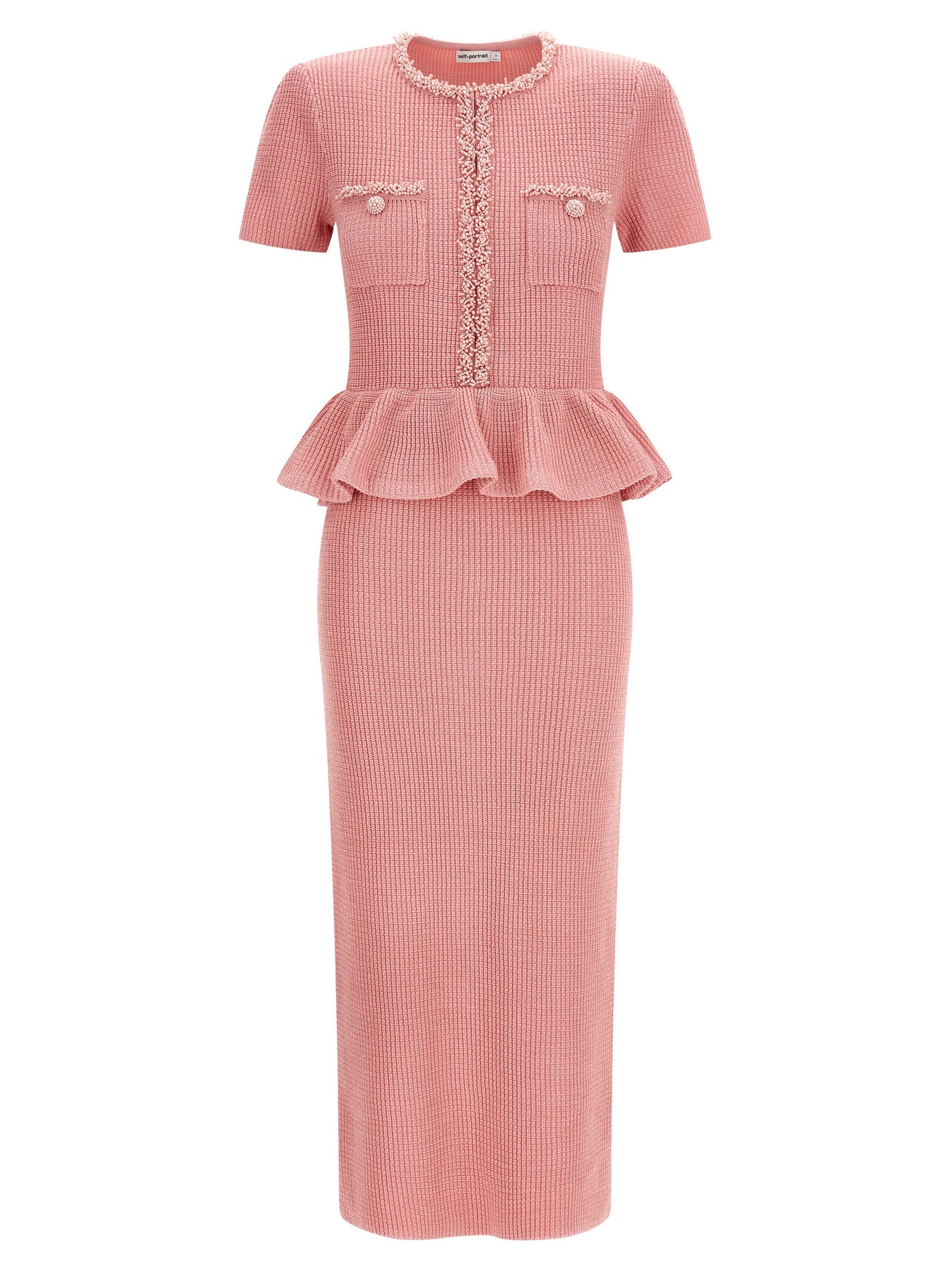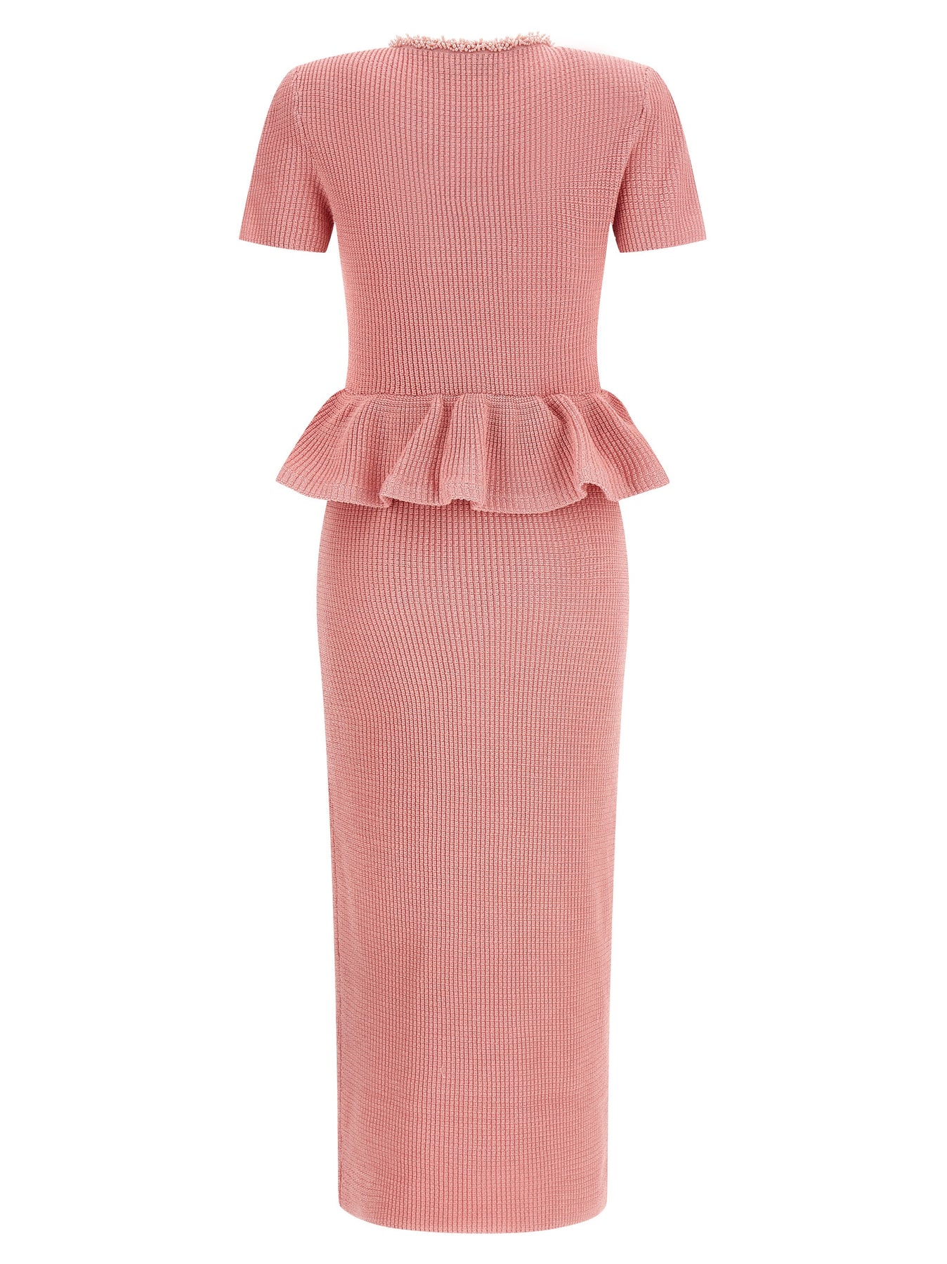 Pink Peplum Knit Midi' waffle knit dress with tone-on-tone beads on the front, crew neck, front hook closure, pockets, peplos waistband, removable padded shoulder straps, short sleeves, sheath skirt.