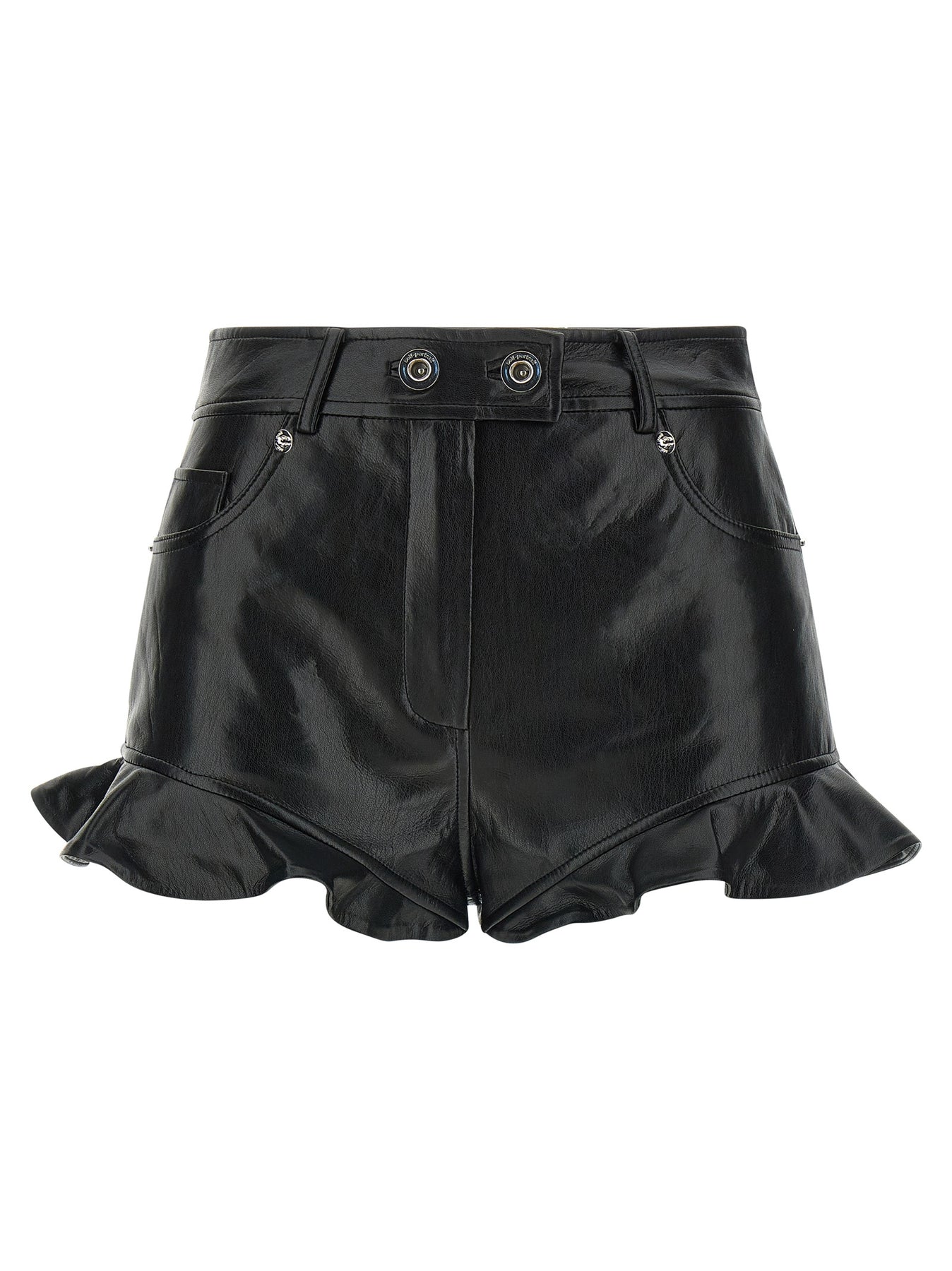 Shorts in stretch leather-effect fabric, high waist, front zip and button closure, five pockets, ruffles on the leg bottom.