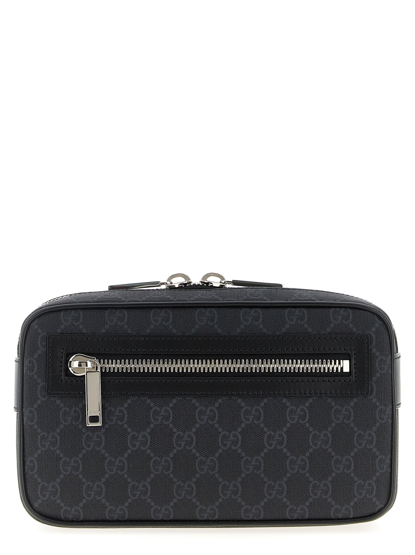 GG Supreme fabric waist bag with leather details, top zip closure, front zip pocket, adjustable sliding Web ribbon fabric shoulder strap with tuc closure.