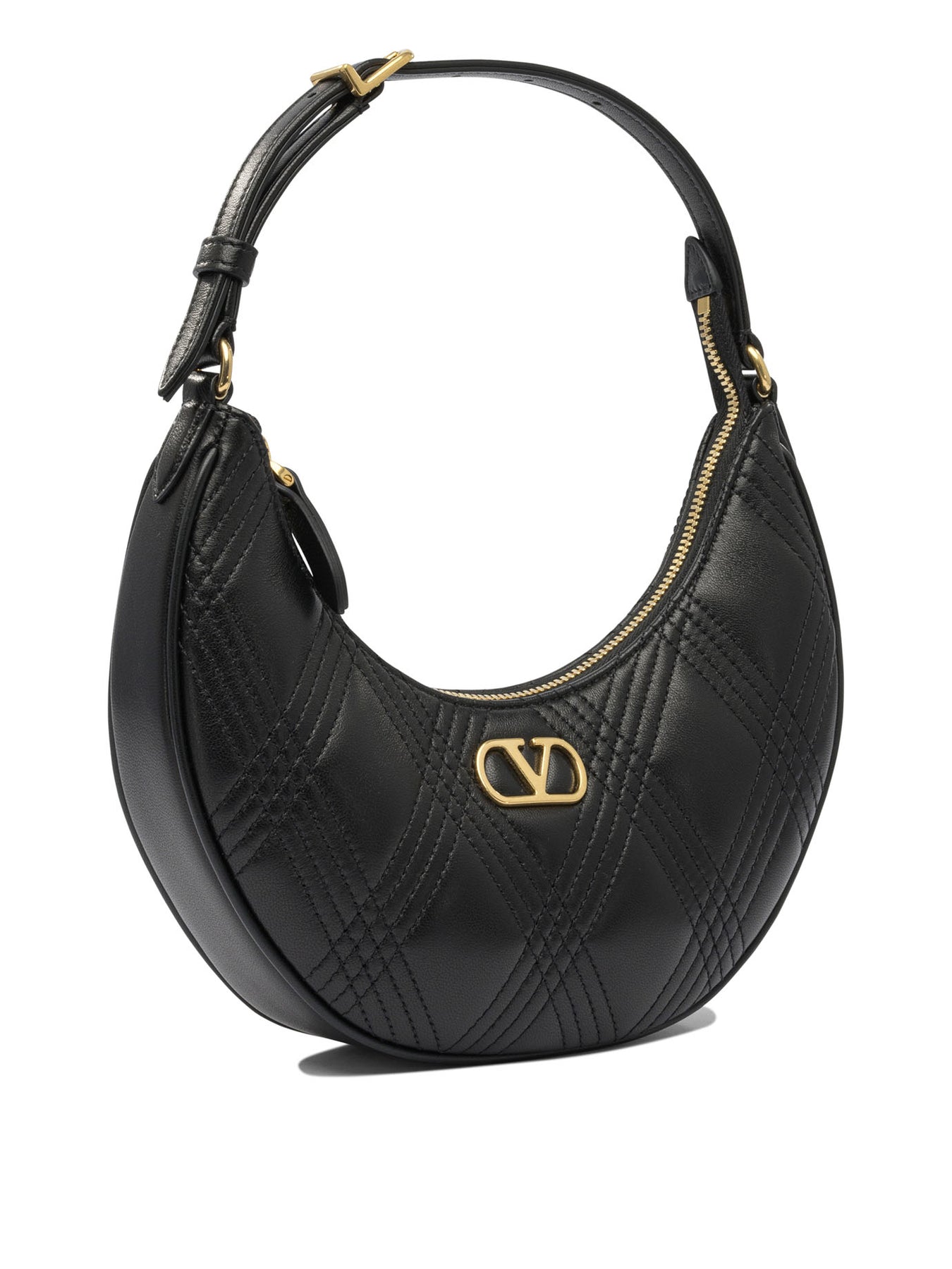 Valentino Garavani "Quiltie 67" hobo shoulder bag with soft texture and curved silhouette. Made of nappa leather, it features quilted workmanship with diamond pattern highlighted by tone-on-tone topstitching. The metal elements have antiqued gold and antiqued brass finishes. The top closure is flanked by a frontally applied Signature VLogo detail. The materials and construction lend a defined compactness to the typical shoulder bag shape. || - Metallic VLogo Signature logo with antiqued brass finish - Quilted diamond-patterned workmanship with tone-on-tone topstitching - Metallic parts in antiqued gold finish - Top zipper closure