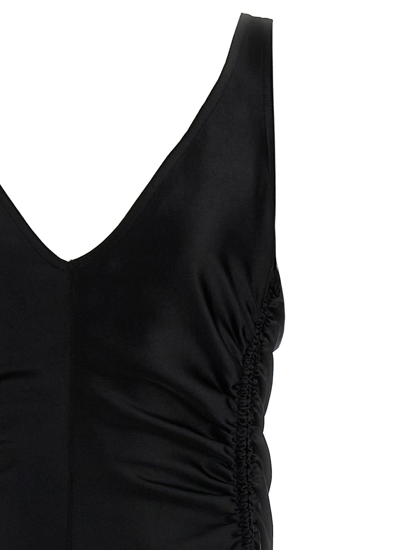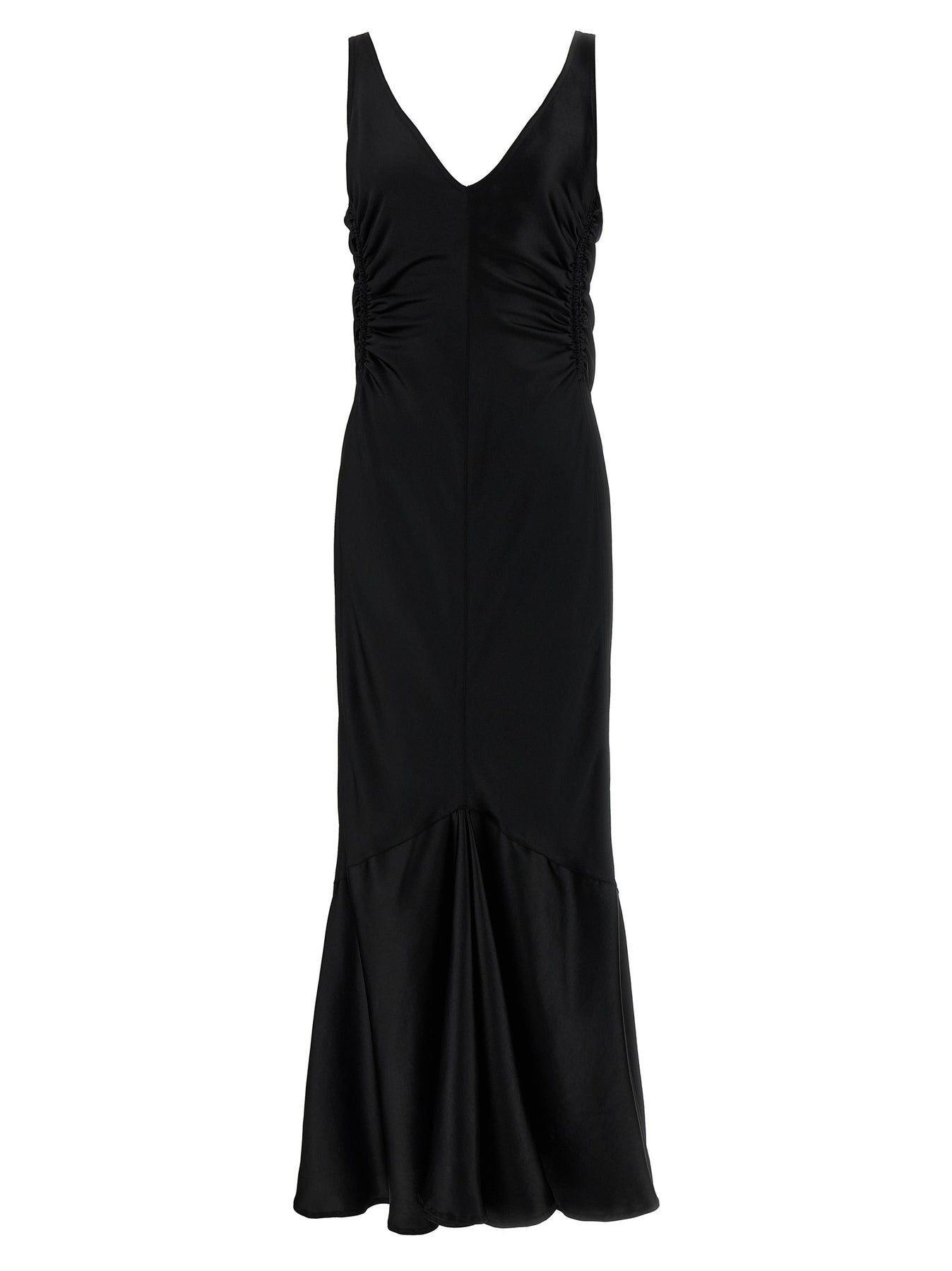 Long satin Katia dress, deep V-neck front and back, crinkled hips with elastic, sleeveless mermaid skirt with oblique cut.