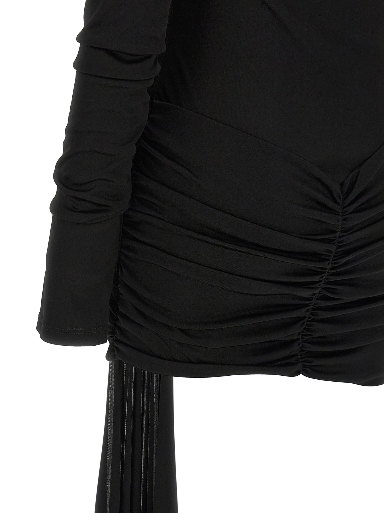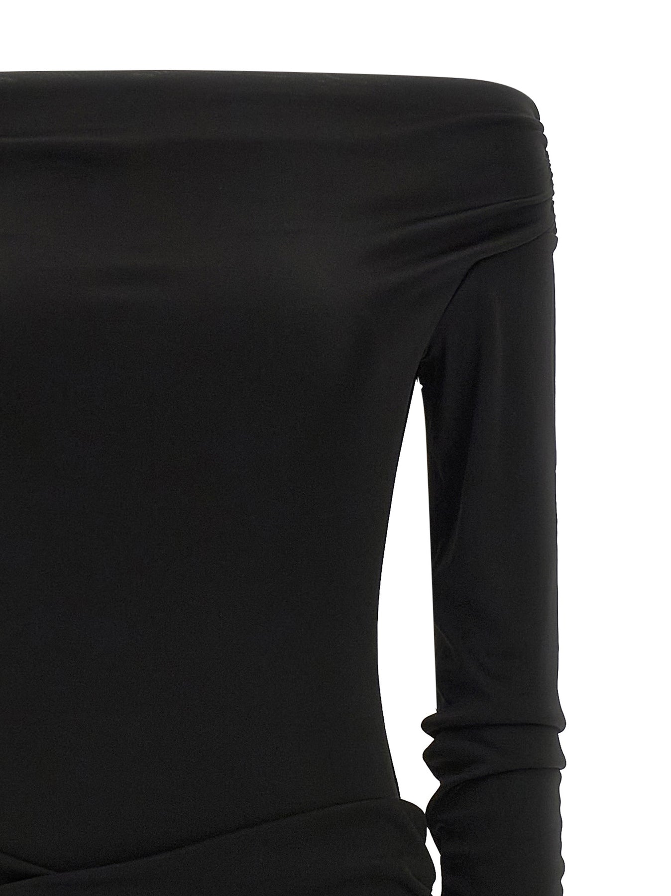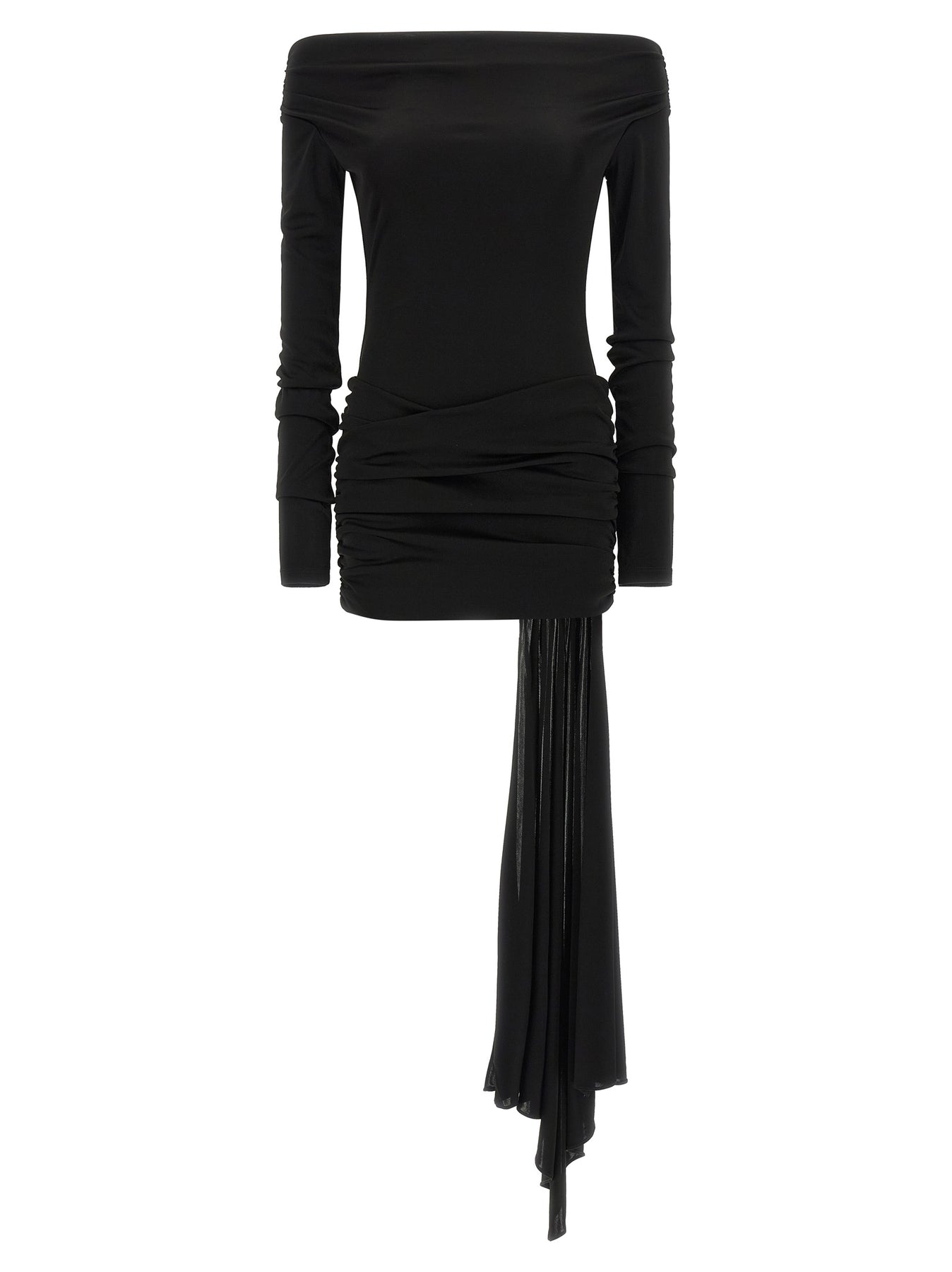 'Wendell' off-the-shoulder shiny jersey mini dress with long sleeves, curled skirt with front draping and ruffles at the back, asymmetrical hem with side train.