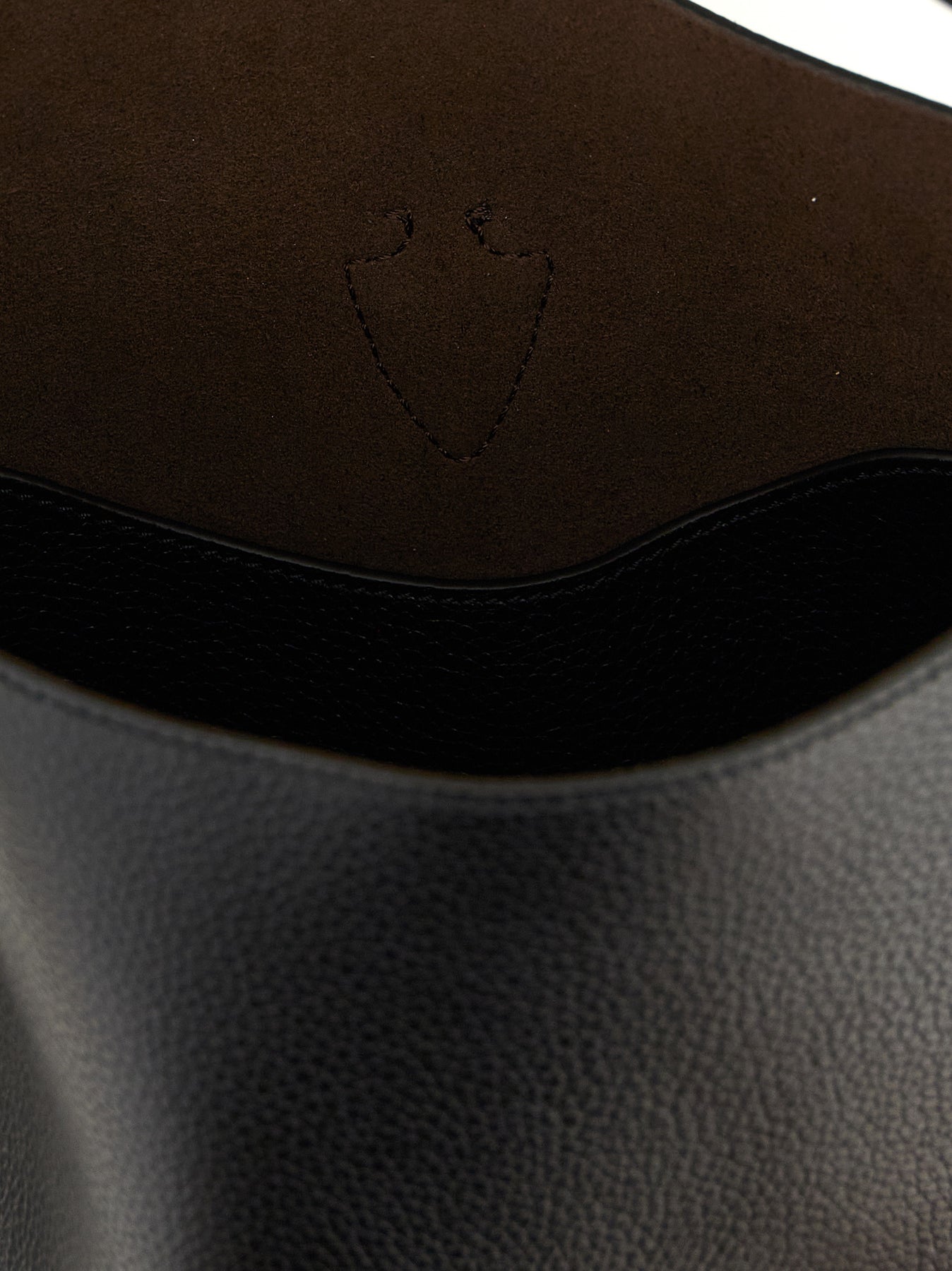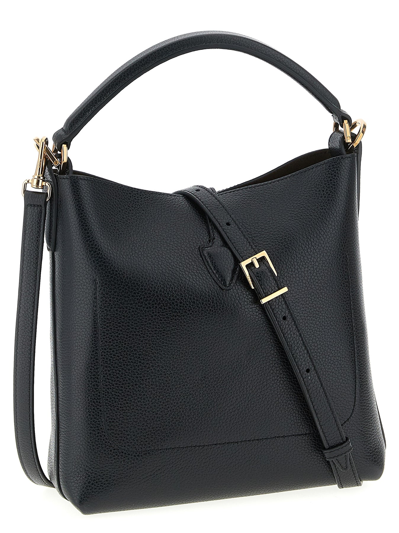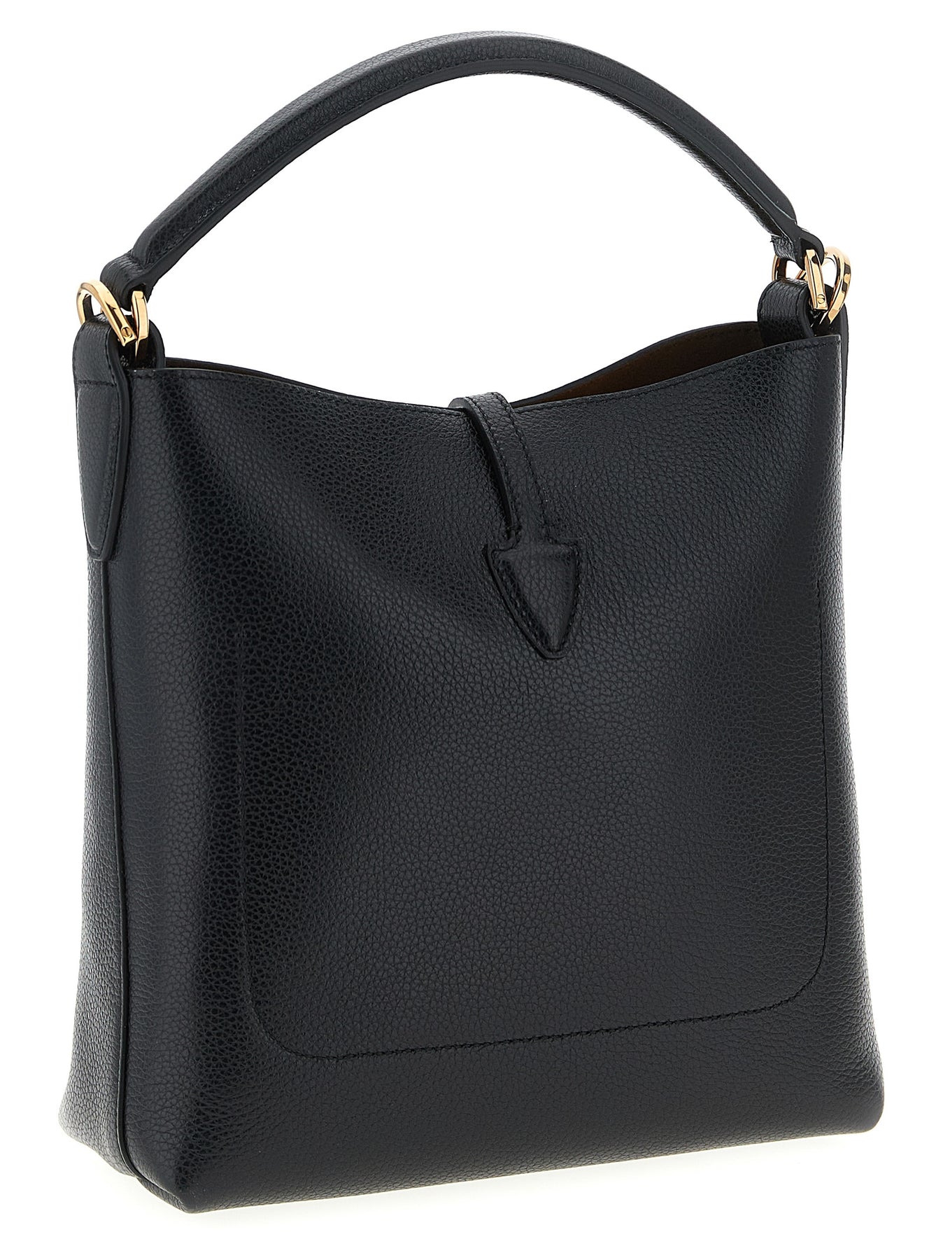 Mini bucket bag in hammered leather, band and snap button closure with front metal 'T Timeless' detail, fixed handle, adjustable and removable shoulder strap.