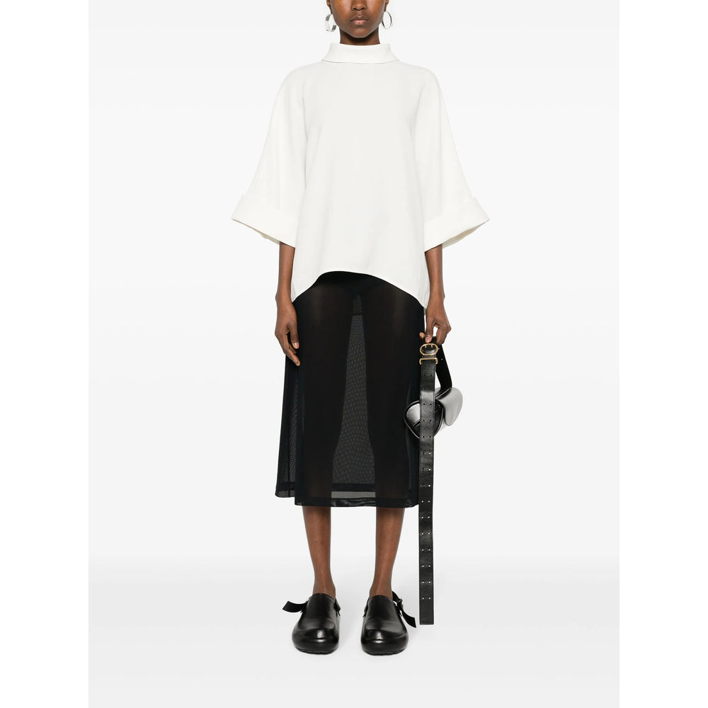 ivory white crepe texture fabric-covered buttons spread collar V-neck/keyhole neck short sleeves turn-up cuffs front slit front single button fastening high-low hem unlined