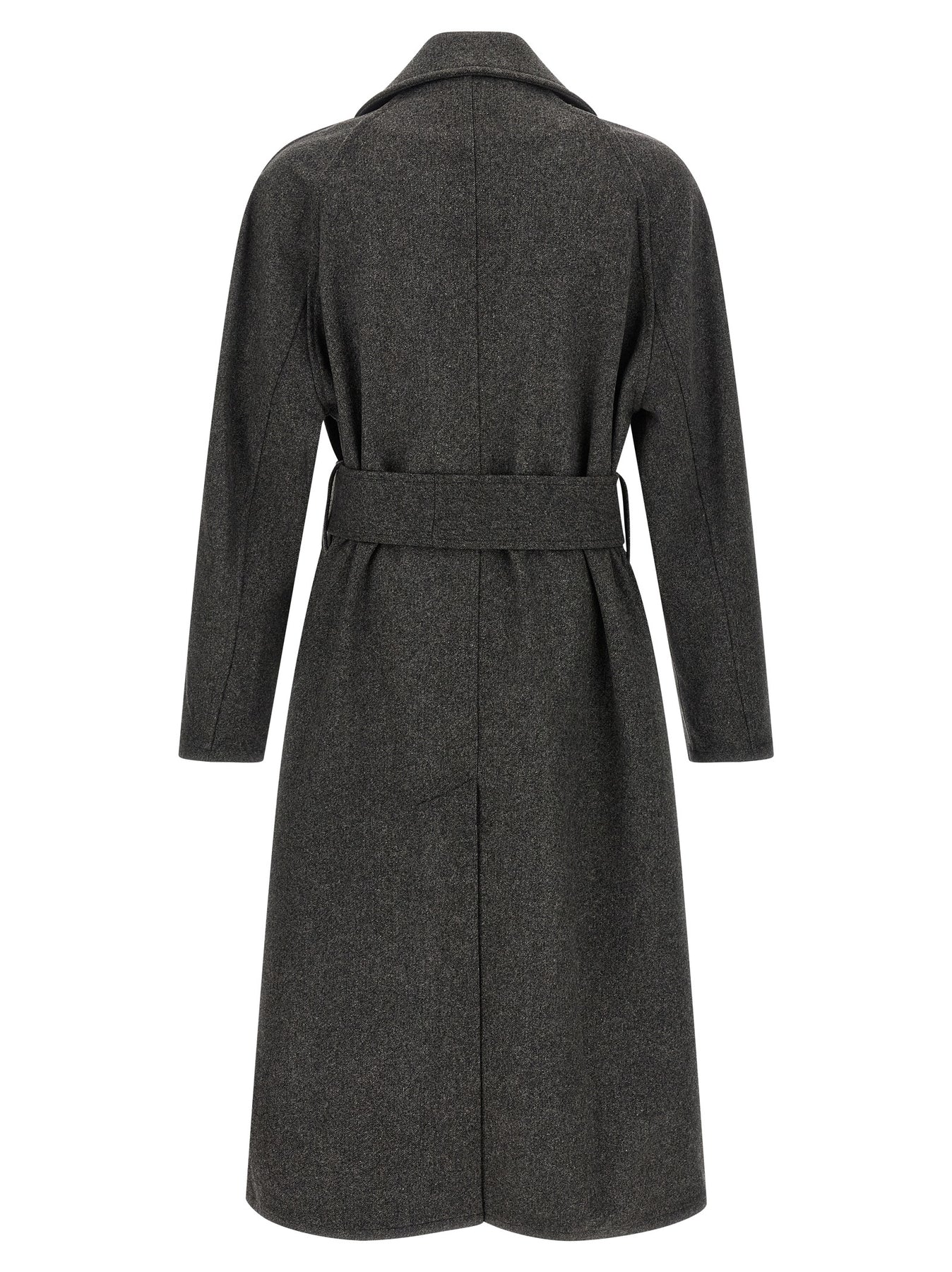 Long single-breasted 'Le Manteau Città' mottled and unlined compact wool coat with front button closure, lapel collar, welt pockets, long sleeves with dropped shoulder, back button split, and removable belt.