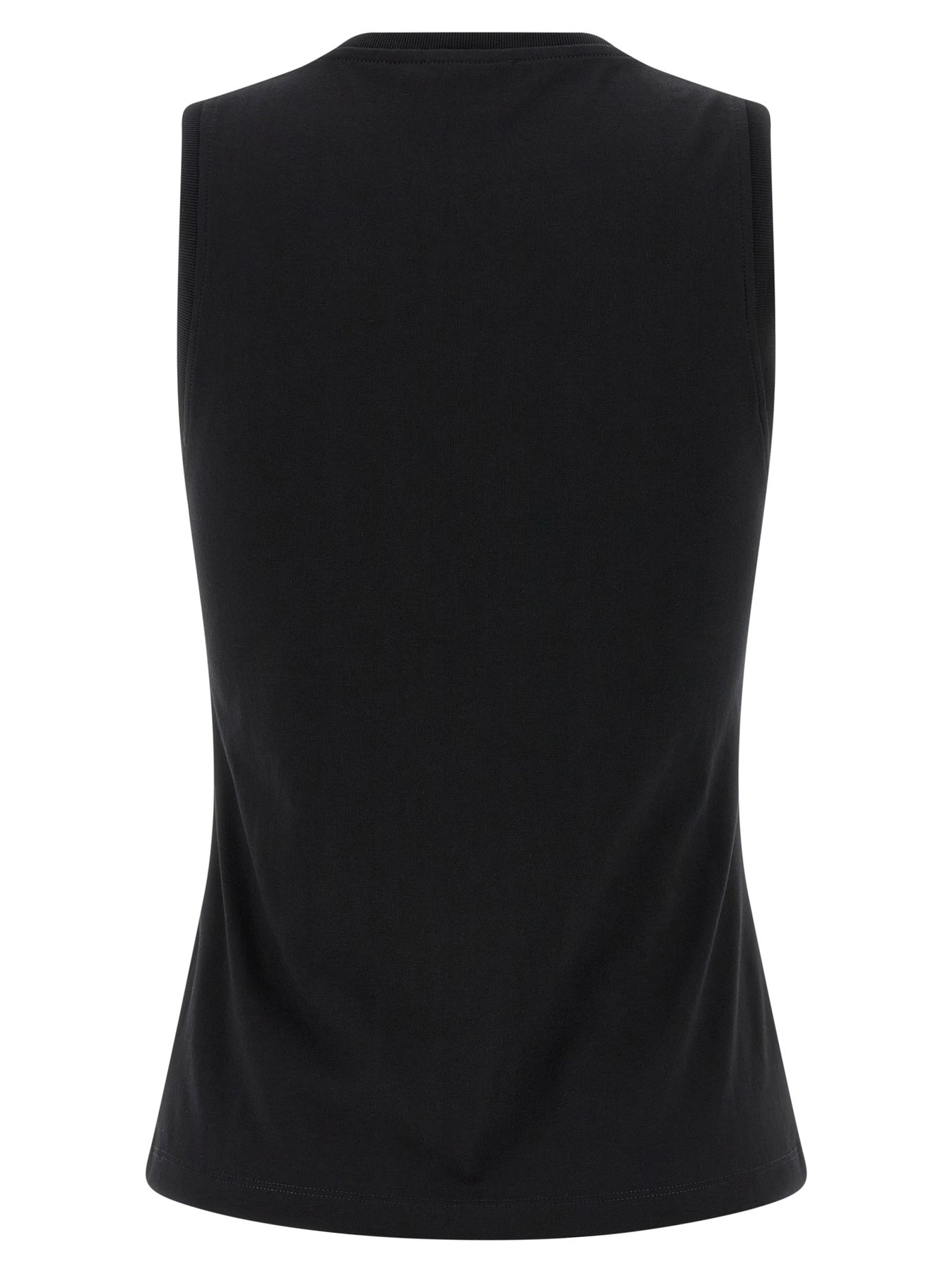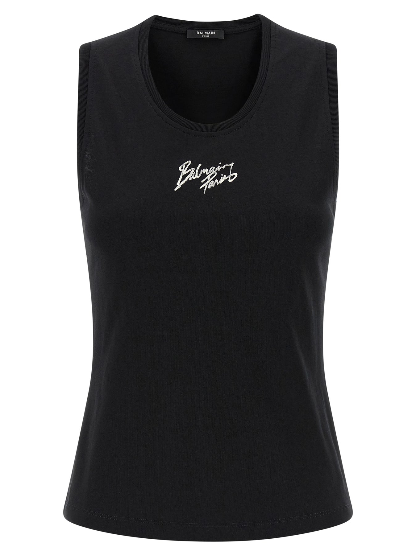 Cotton top with round neckline, front 'Balmain Paris' print, sleeveless.
