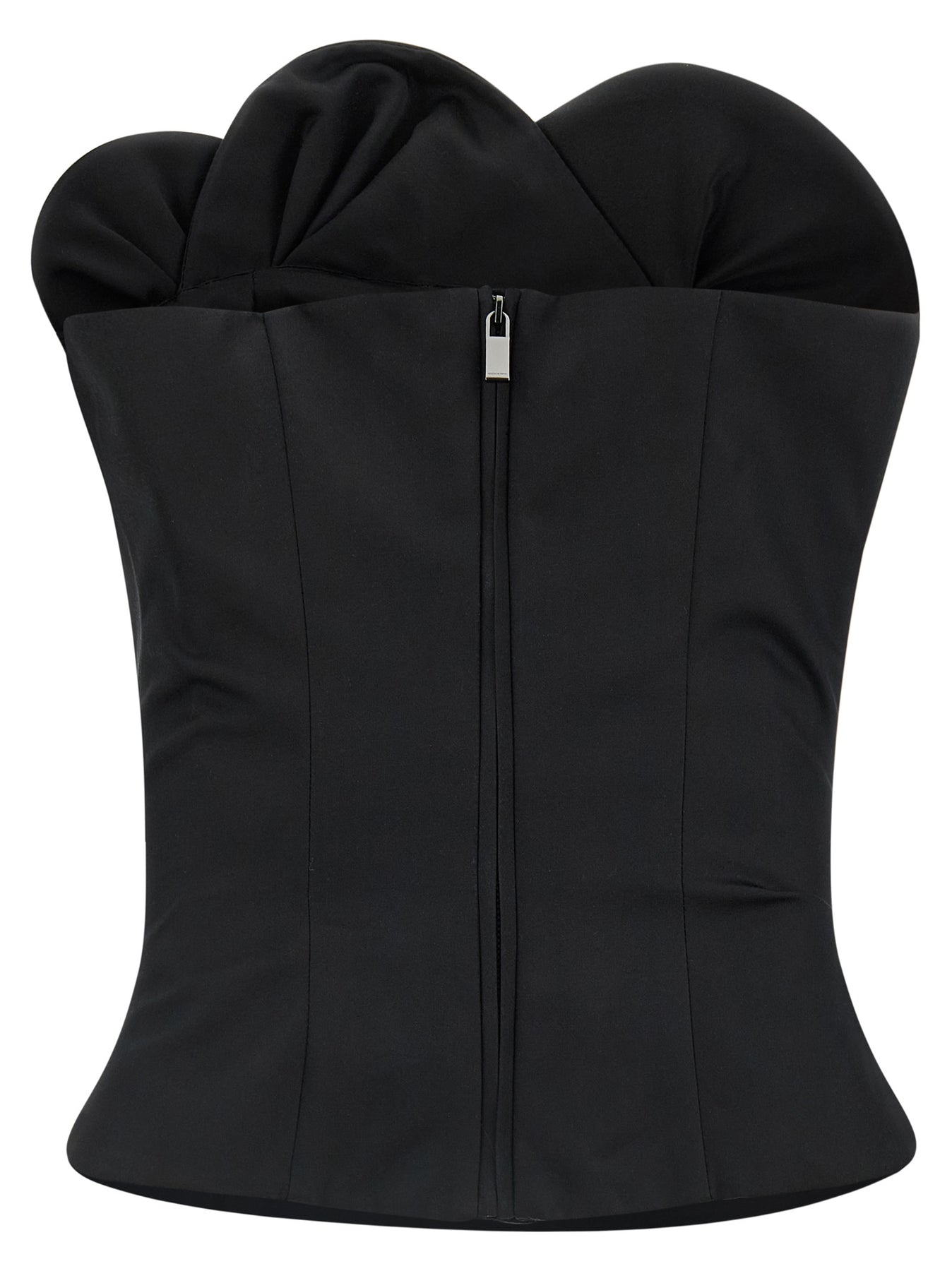 '01' off-the-shoulder corset top in wool and silk with front floral sculptural detail, inner slats, back zip closure, silk lining.