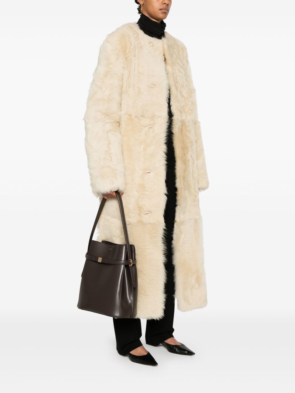 coffee brown calf leather smooth grain bucket body detachable belt clasp fastening single shoulder strap main compartment multiple internal slip pockets suede lining metal feet