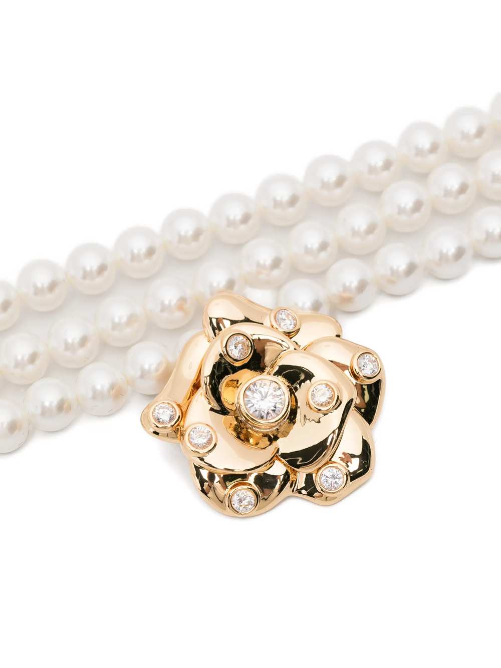 Pendant necklace Features Cream white/gold tone Pearl detail Floral motif Crystal decoration Chain detail Clasp closure Daily use and external agents may reduce the luster of gemstones and gold. To maintain their lustre, use non-abrasive products specifically designed for jewelry cleaning. Composition Brass, Zircon, ABS pearls ID RS26614NP