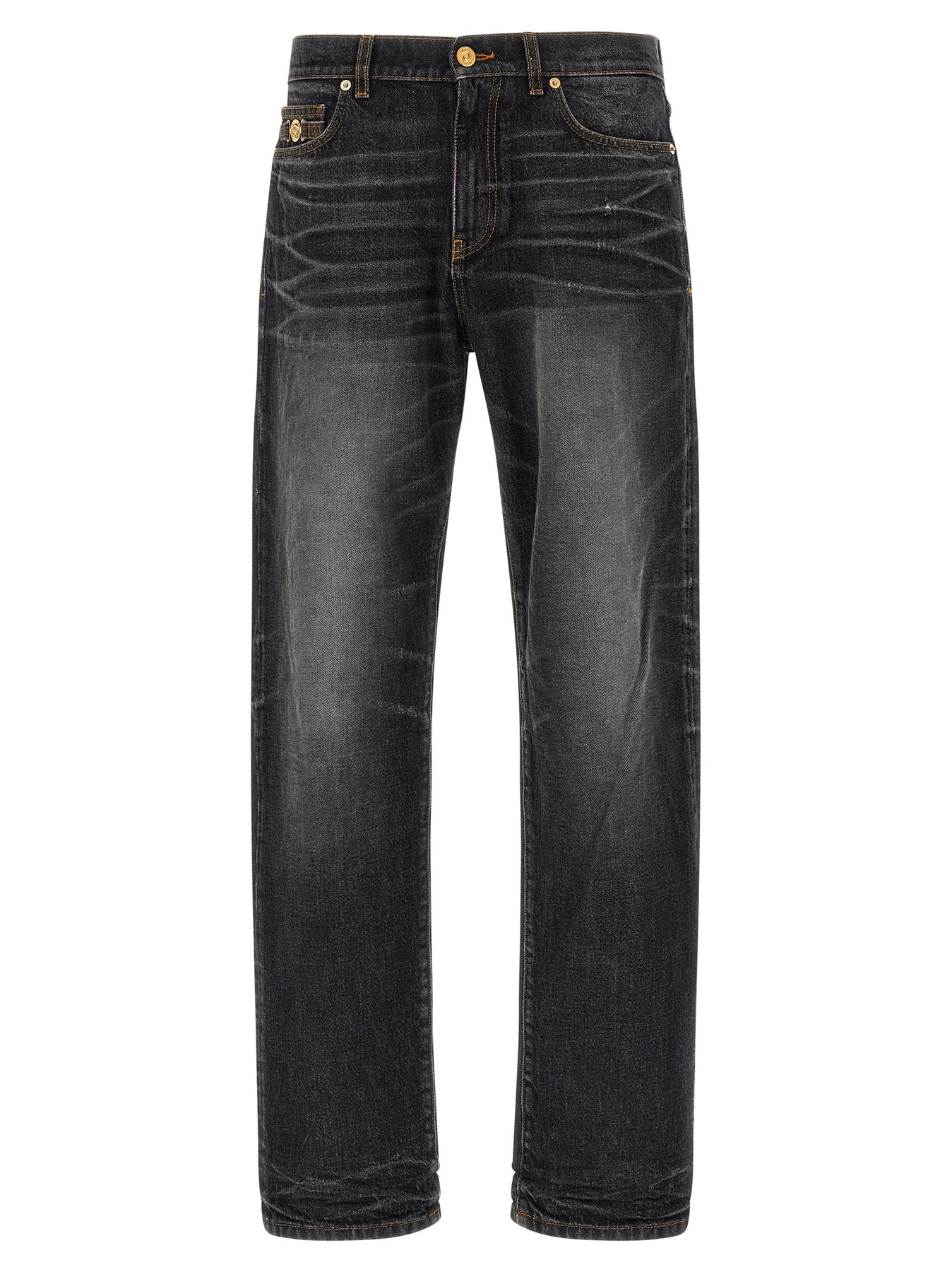 Stonewashed cotton denim jeans with contrast stitching, five pockets with metal 'Medusa Biggie' detail, straight leg, front zip and button closure, and leather logo label at the back.