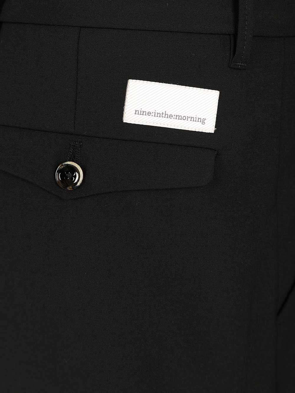 Nine In The Morning wool blend "Odell" short trousers with a very wide and flared cut, double front darts on each side, with belt loops and dark tortoiseshell button fastening, side welt pockets, back welt pocket with pointed flap and button fastening.