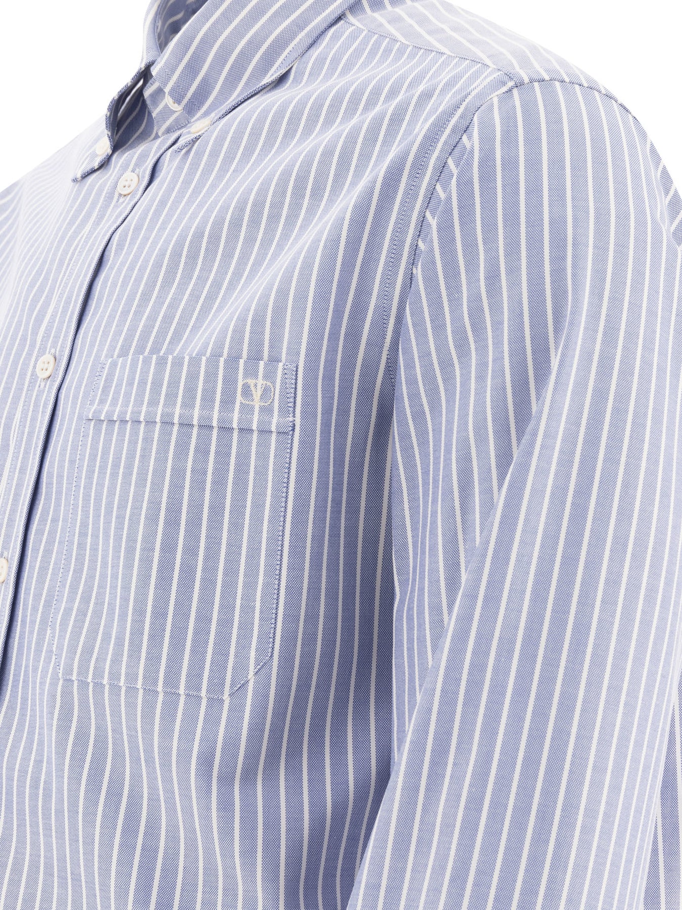 Valentino cotton striped shirt, constructed from a compact fabric based on natural yarn, features a button-down collar stabilized by linear seams. The structure is defined by front and back panels joined by sharp side seams, long sleeves with regular cuffs and a full front button placket. A tone-on-tone thread-embroidered logo pocket is applied to the chest, featured prominently on the upper torso. || - Striped - Button-down collar - Long sleeves - Patch pocket with embroidered logo - Front button closure - Cotton - Regular fit