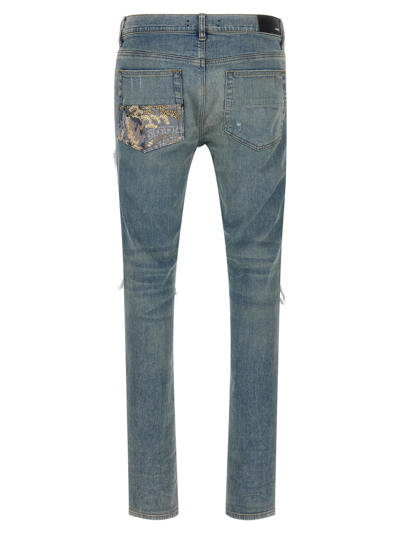 'Crane MX1' used-effect stonewashed stretch cotton denim jeans with visible repair in ribbed damask fabric, front button closure, five pockets, and back leather logo tag.