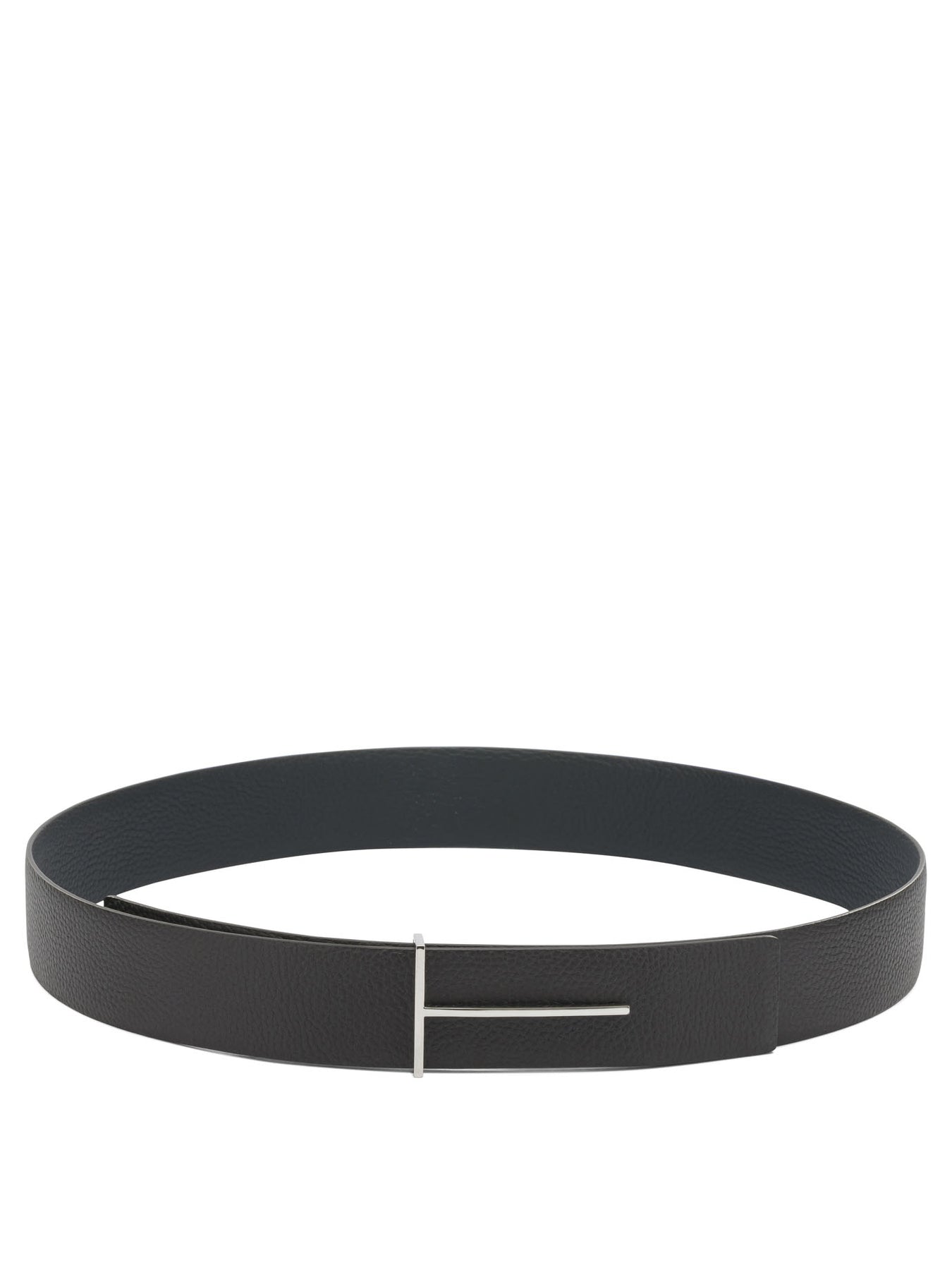 Tom Ford "T Icon" belt, made of grained leather with soft grain. The construction features a uniform surface with visible texture. The linear silhouette is defined by the T-shaped metal buckle, a distinctive element of the product. The compact construction ensures adjustable fit through integrated holes in the main band. The absence of contrasting seams contributes to a uniform and continuous appearance. || - Grained leather, soft grain - T-shaped metal front buckle - Adjustability via holes built into the band