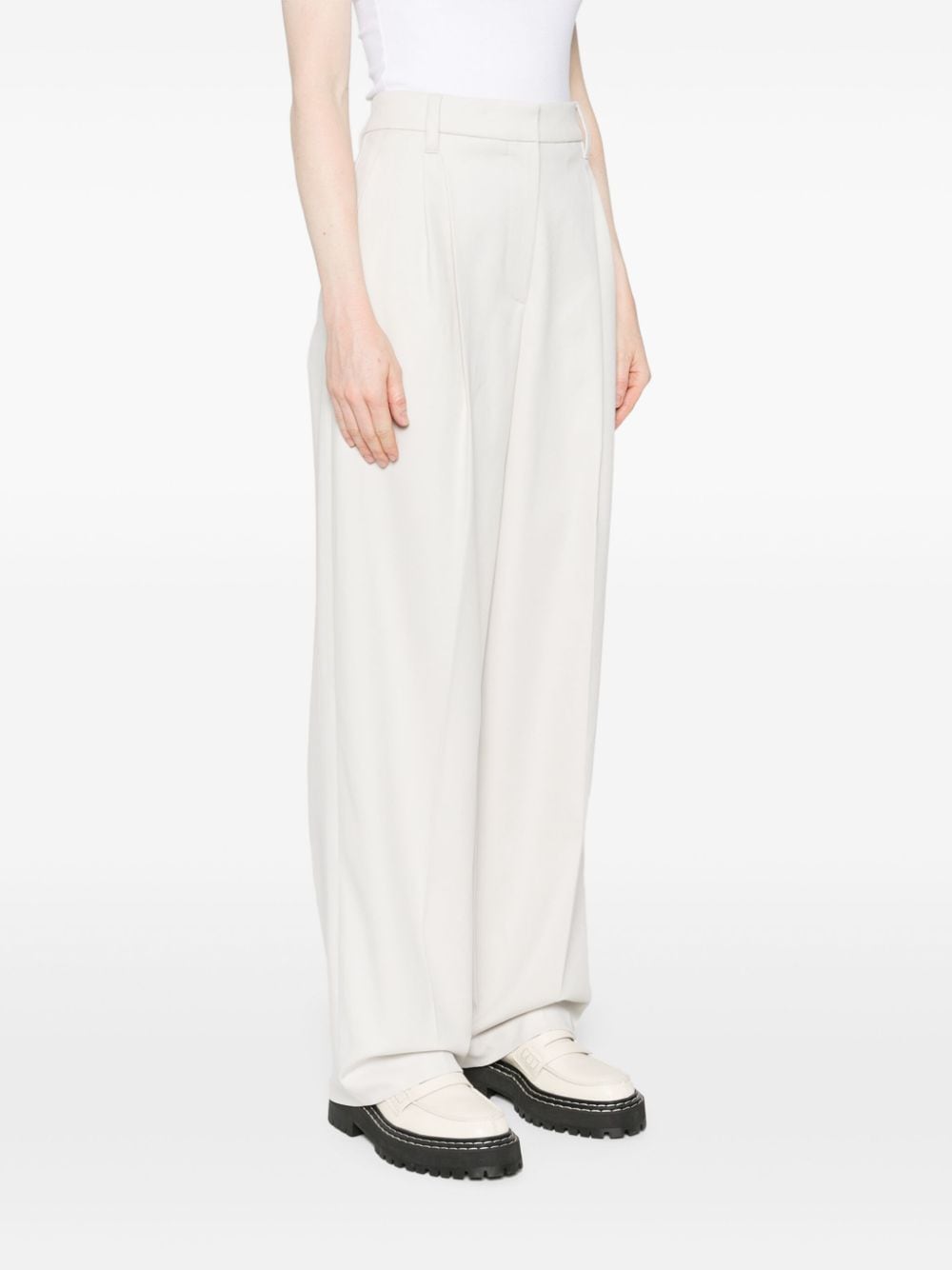 light beige cotton twill weave pleat detailing high-waisted belt loops concealed front button, hook and zip fastening two side slash pockets two rear welt pockets straight leg