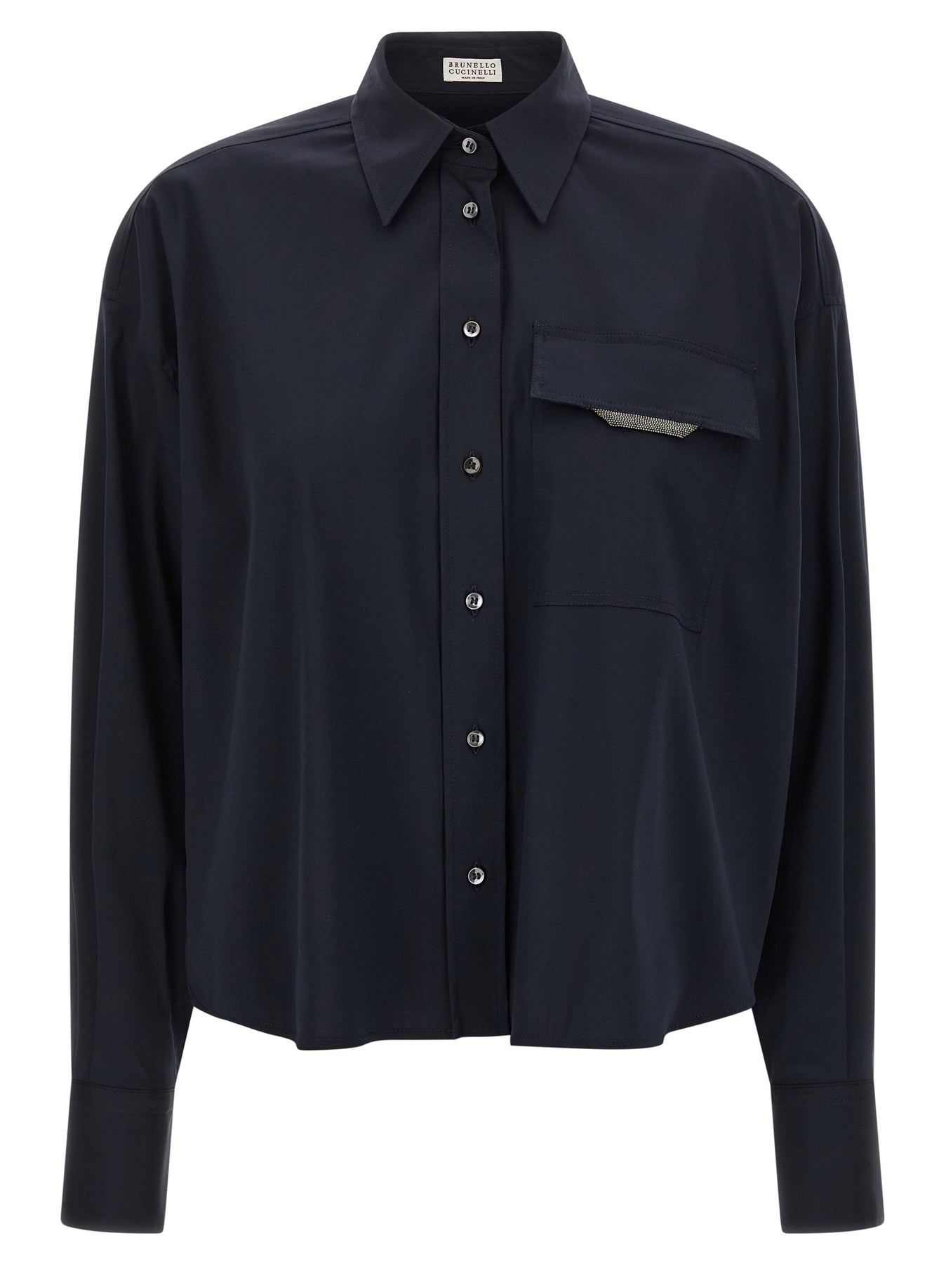 Brunello Cucinelli Shiny Flap Detail Shirt and Blouse - Blue | 0941e25a527b56e1f32fd5f4c9453f4dacb0b758