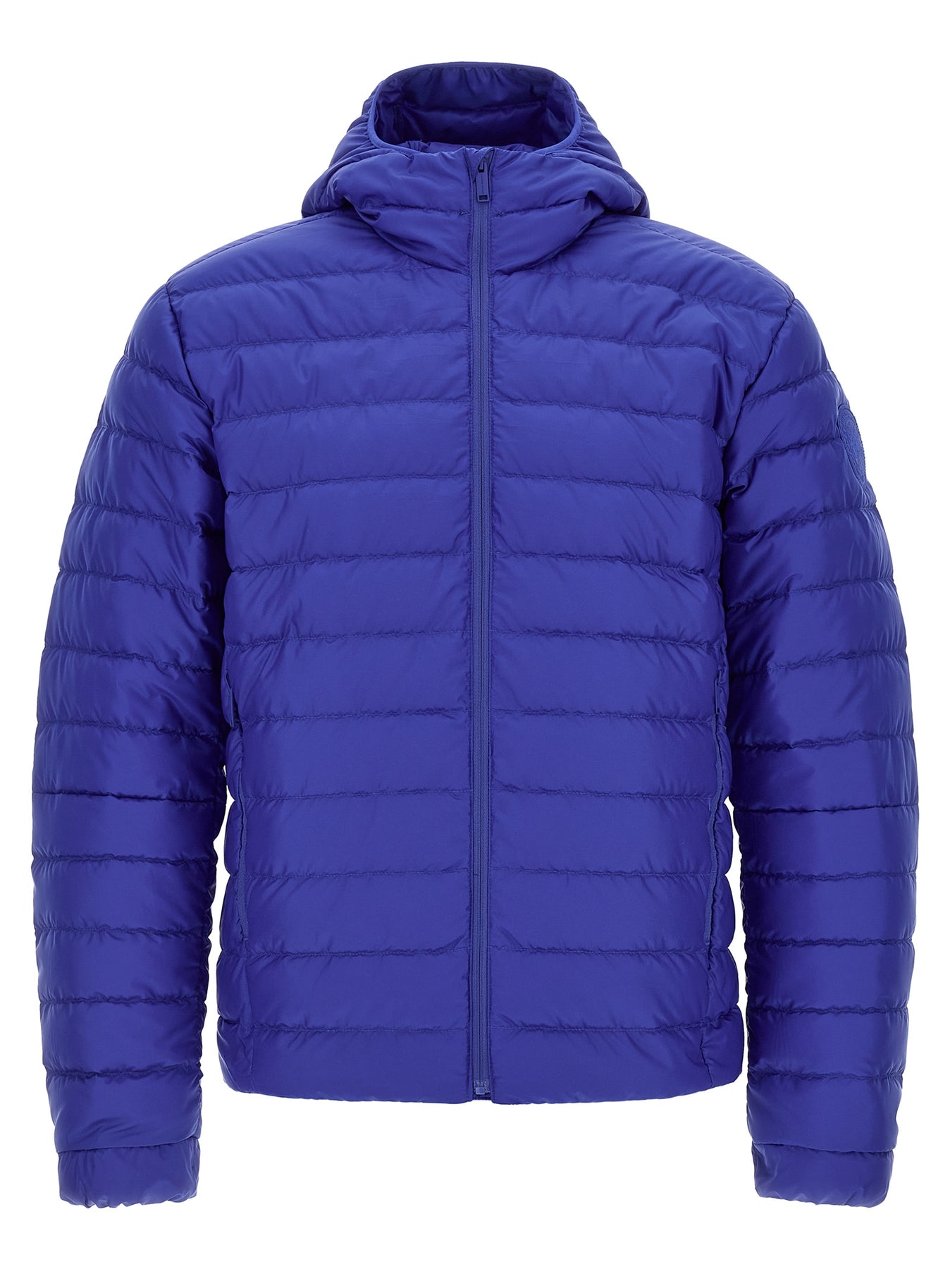 'Stratus' water-repellent down jacket with ripstop structure, quilted and slightly padded with goose down, hood, front zip closure, pockets, long sleeves with elastic cuffs and tone-on-tone logo patch appliqué, drawstring on the hem, foldable in the right pocket.