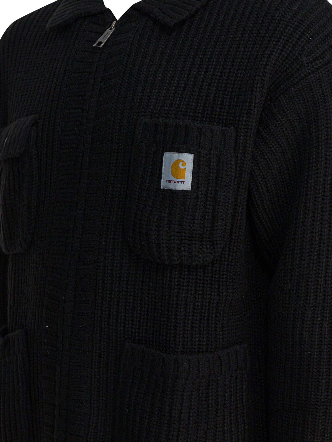 Carhartt WIP lightweight "Chore Knit" jacket with acrylic, wool and nylon blend yarn construction. The silhouette is inspired by work jackets, with straight line, four front patch pockets, one of which is closed by flap and button. Double-slider zipper with logo on zipper puller. Square fabric label applied to the front. Visible stocking at the armholes. || - Applied logo on zipper and zipper puller - Four front pockets, including one with flap and button - Square label sewn on front - Stocking at the armholes - Two-way zipper - Regular fit
