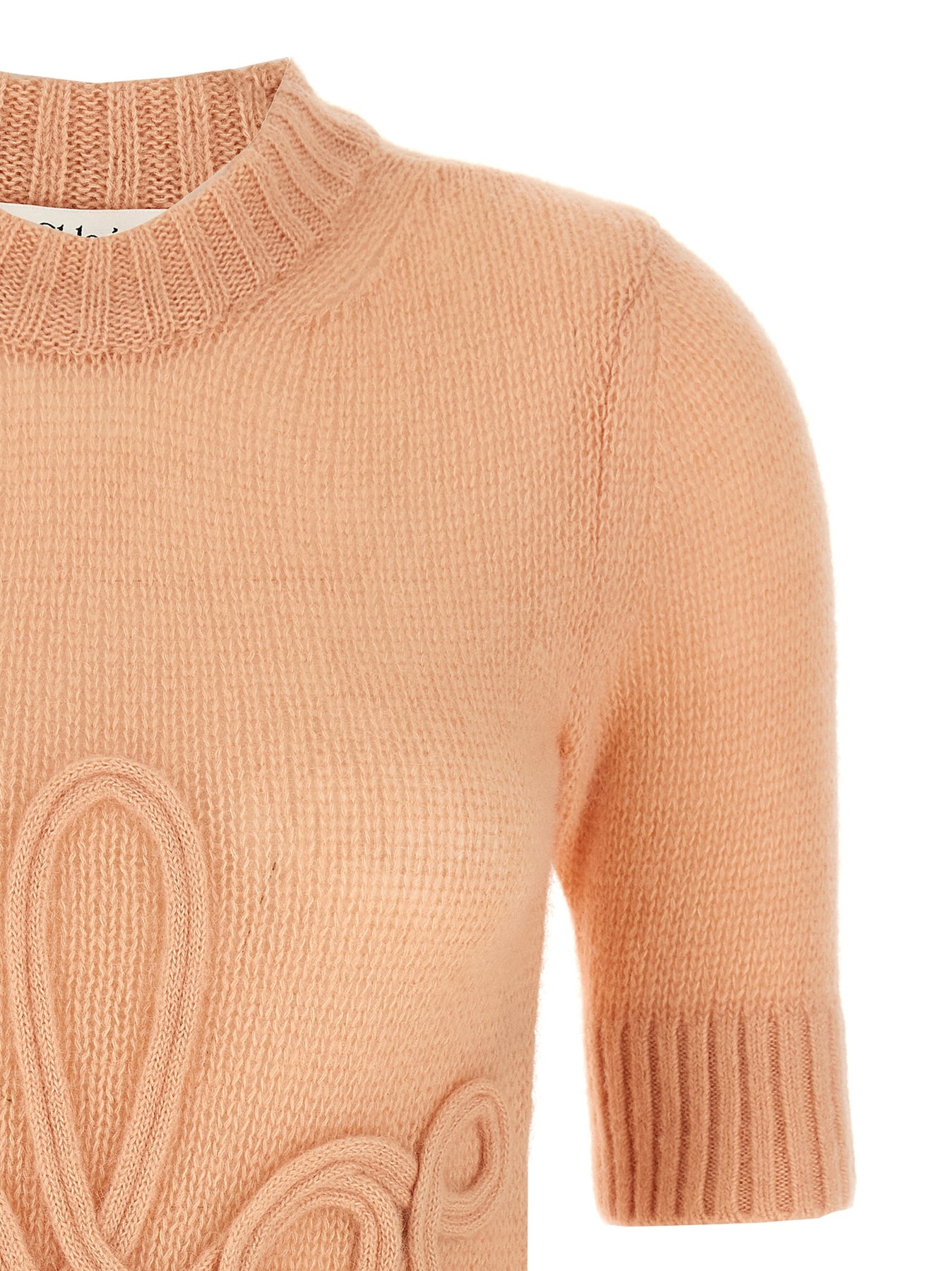 Alpaca wool and silk sweater with tonal logo embroidery on the front, crew neck, 3/4 sleeves.