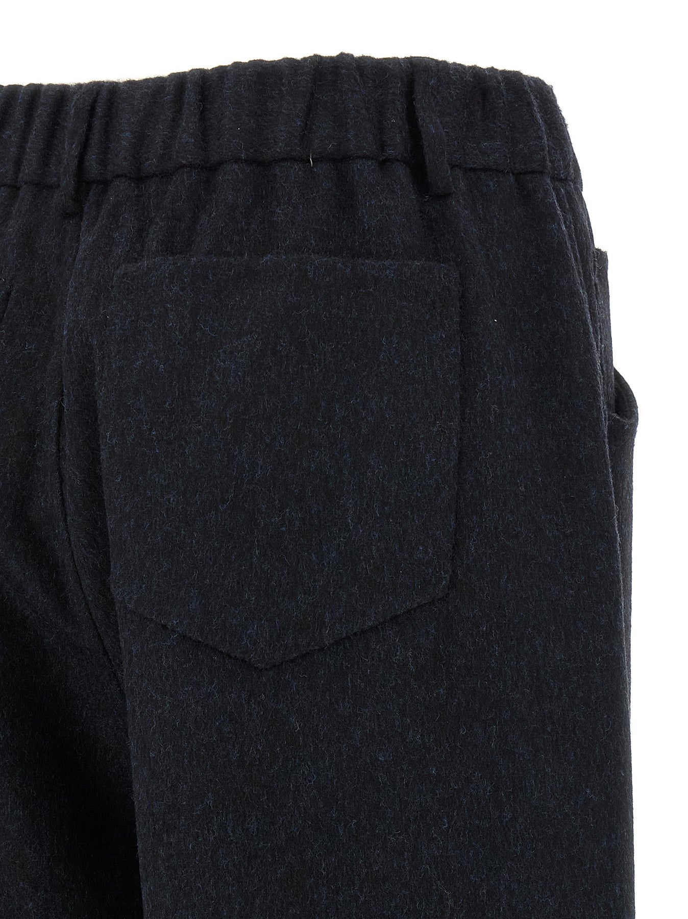 Wool flannel pants, elastic with adjustable drawstring at the waist, zip, hook and button closure on the front, pockets, wide and straight leg.