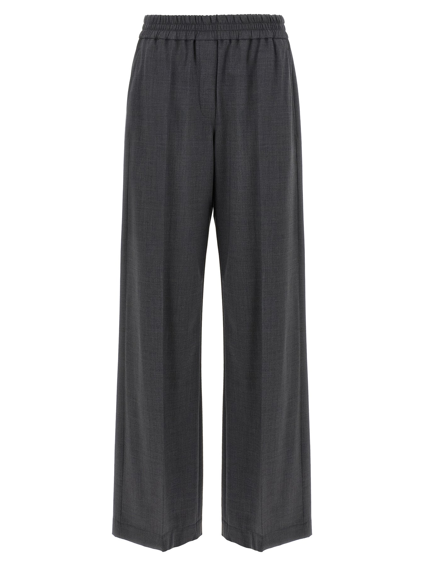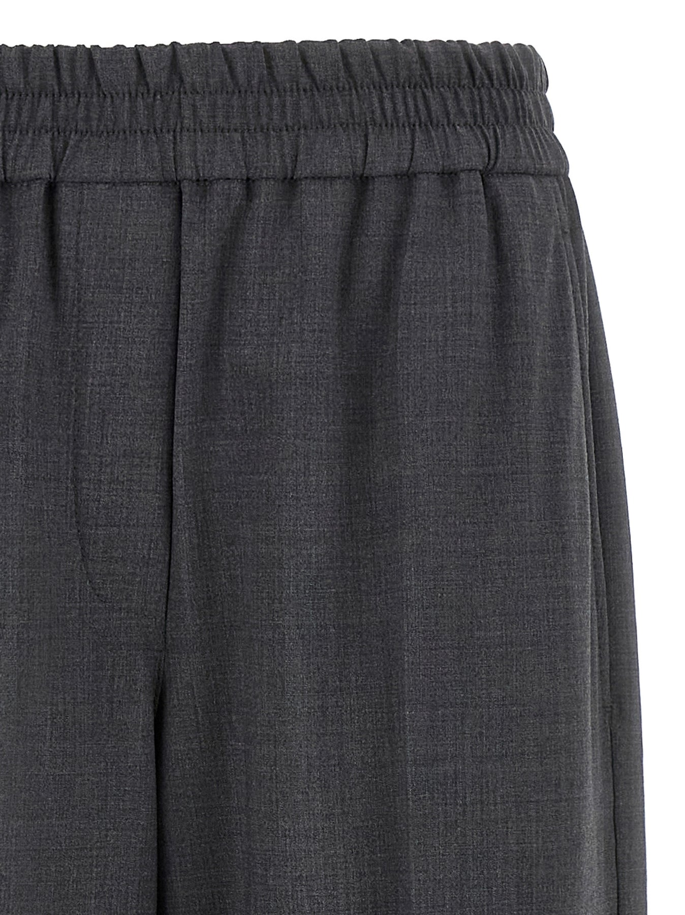 Wool blend trousers, elastic waistband, trompe l'oeil flap, wide and straight leg, stretched pleat, pockets.