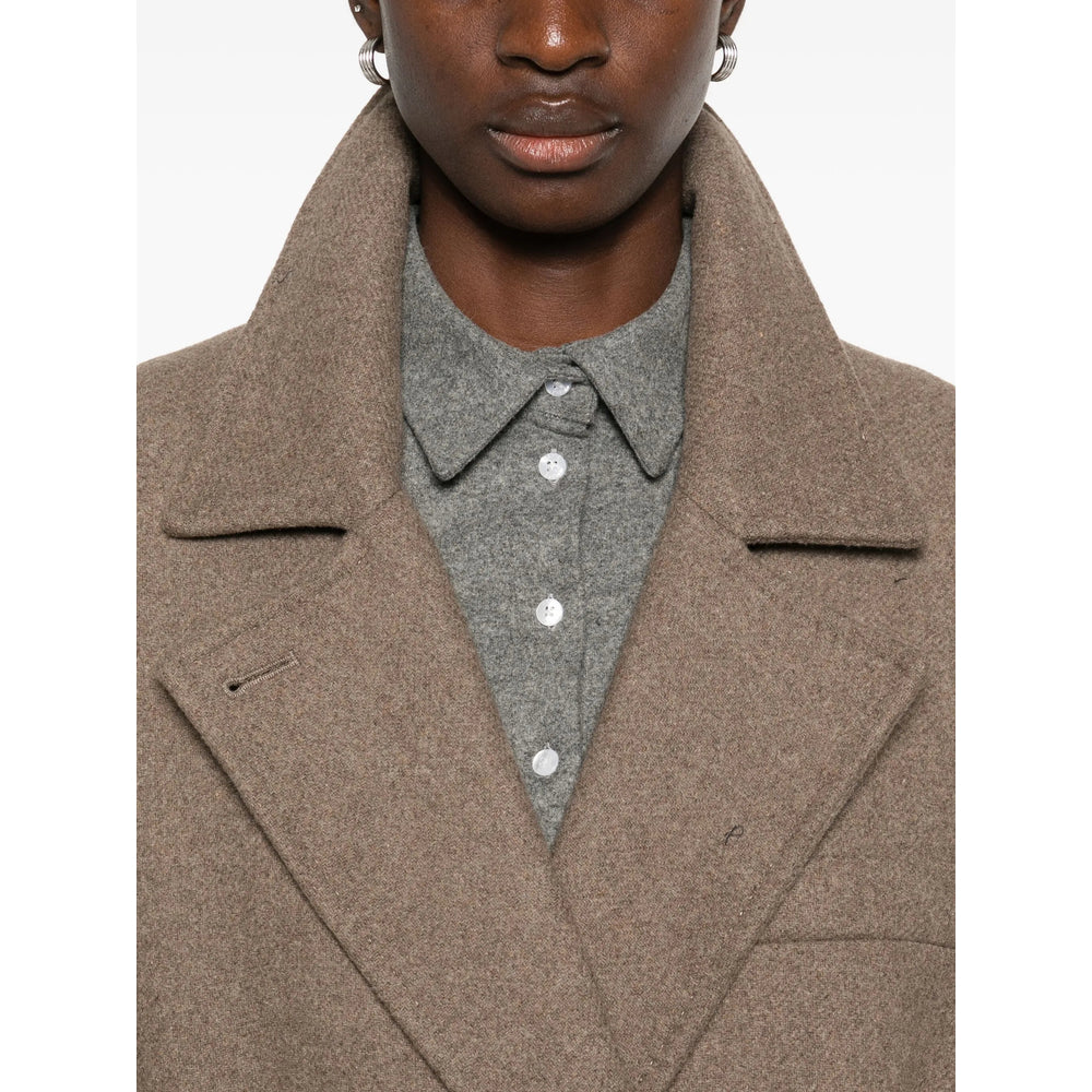light brown double-breasted belted waist buckle fastening notched lapels button fastening