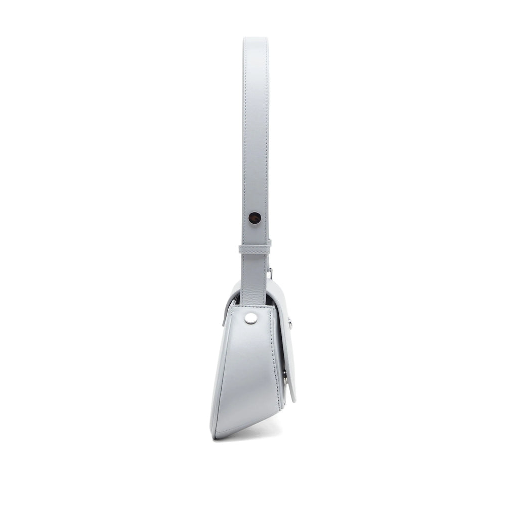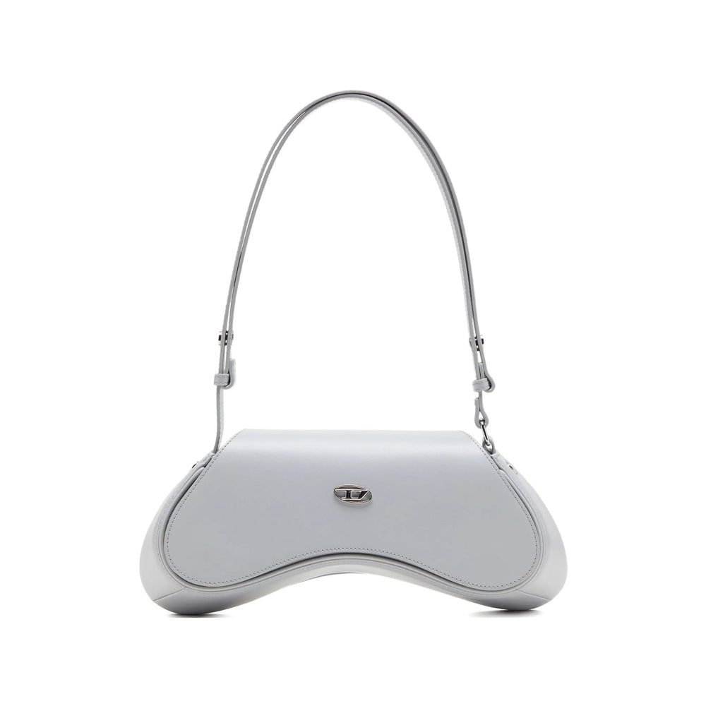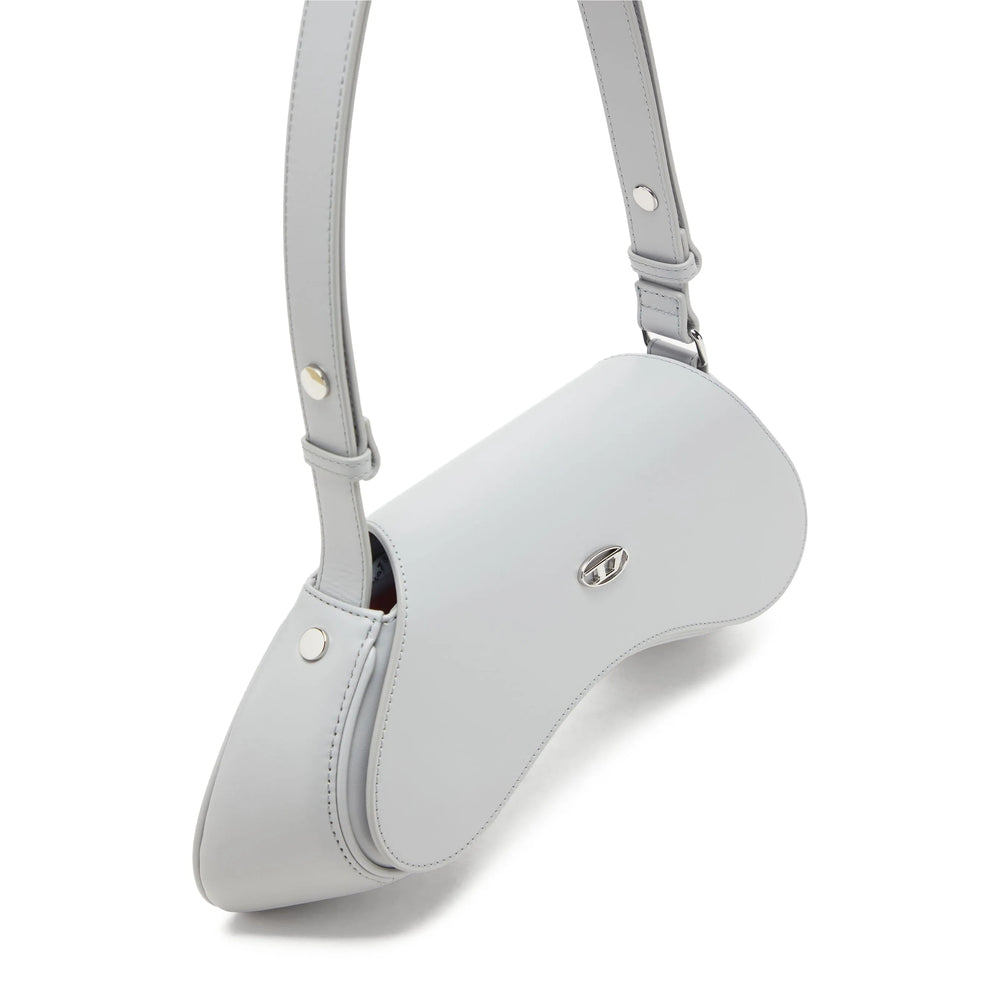 light grey semi-gloss finish oval logo detail adjustable shoulder strap curved shape