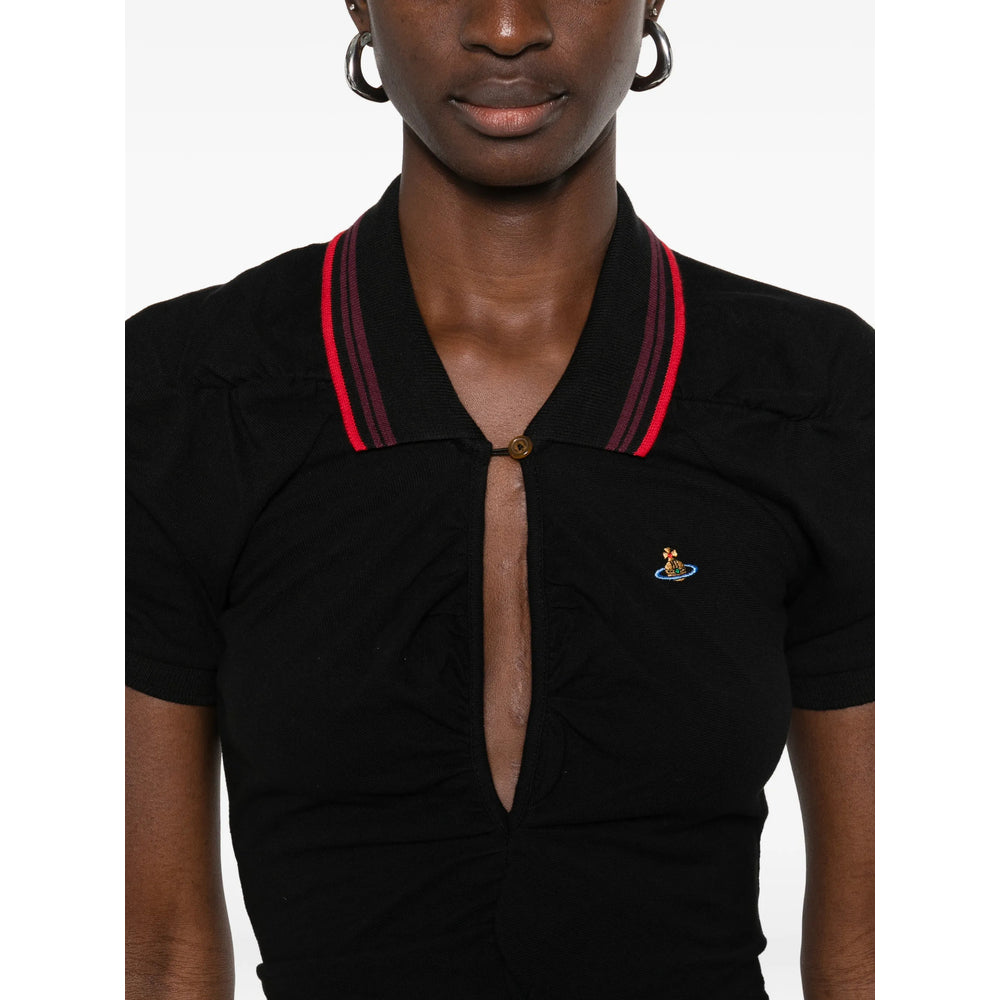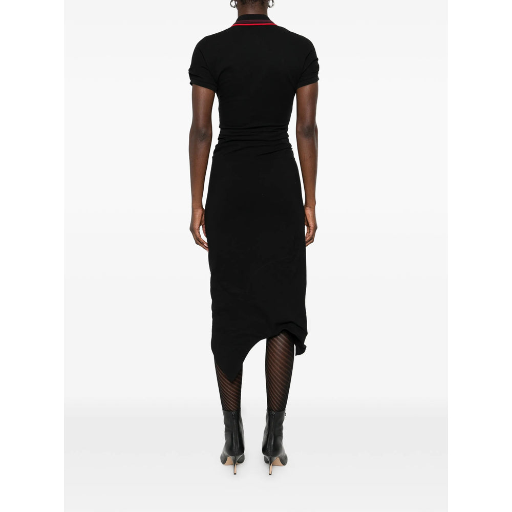 black V-neck asymmetric hem short sleeves ruffled detail collar trim