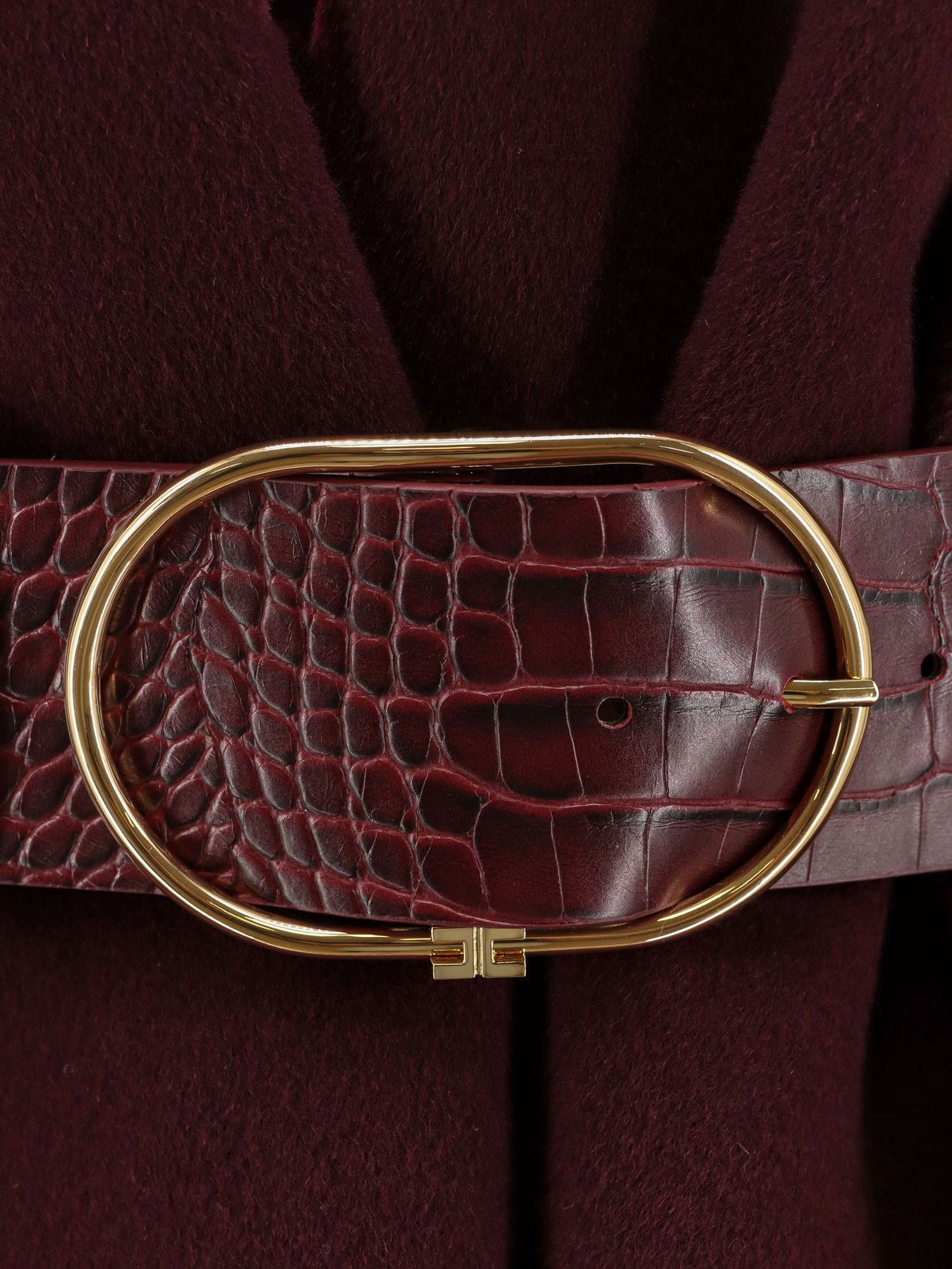 Side slits Belt closure Adjustable waistband with crocodile print Unlined 100% wool SKU: CP67D56E2EA4