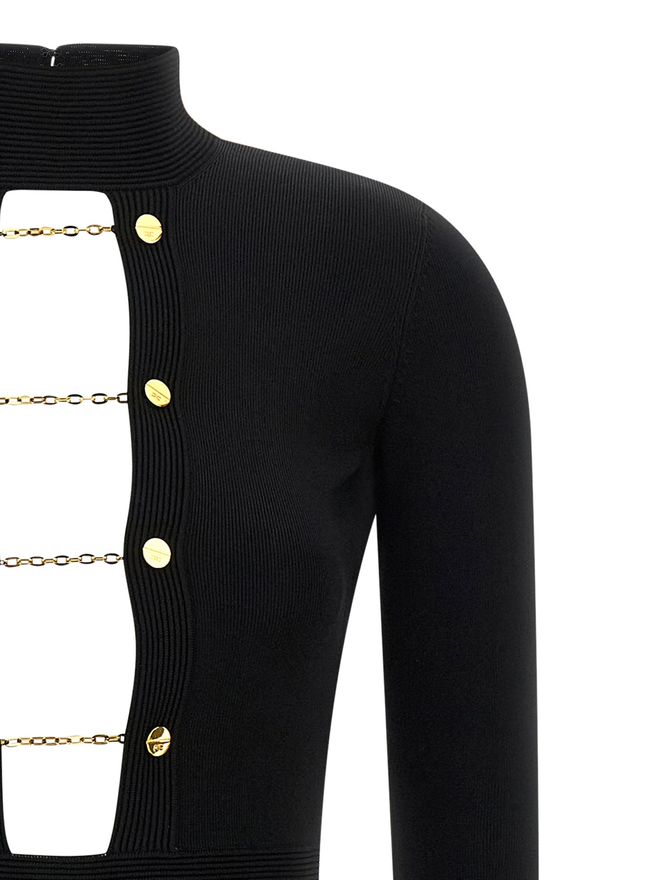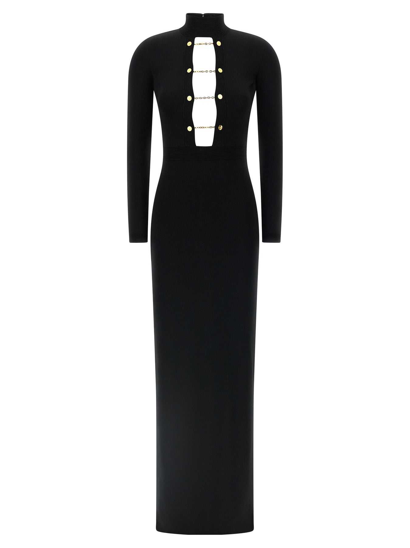 Long viscose knit Red Carpet dress, high neck with back hook closure, wide front cut-out with jewel cufflinks with metal chain, long sleeves, tube skirt with metal buttons and back split, porthole on the back, side zip closure.