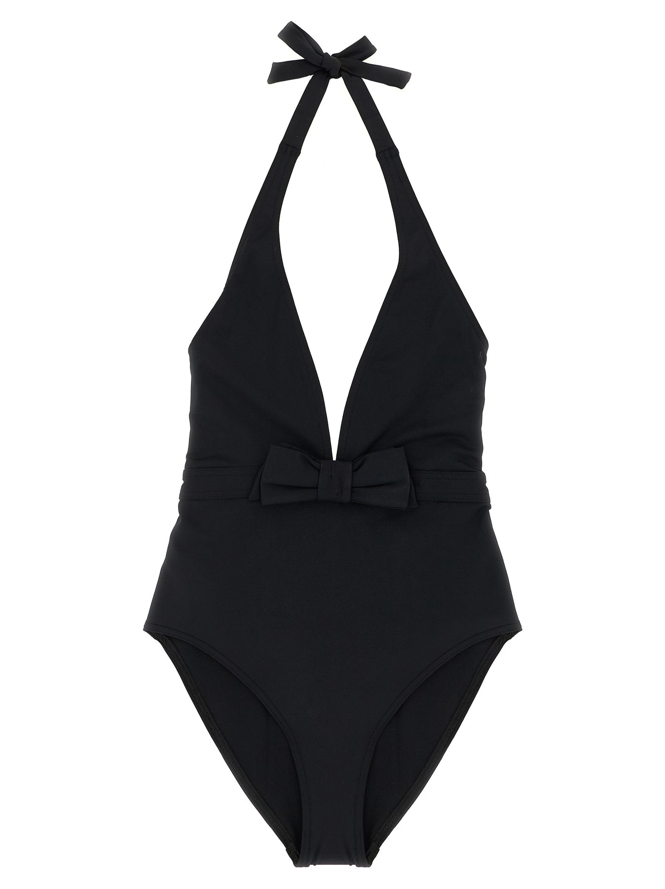 'Couture' one-piece swimsuit in Peau Douce* fabric with deep V-neck on the front, overlapping band at the waist with tone-on-tone bow detail, ties to tie behind the neck, wide round neckline at the back, classic leg.