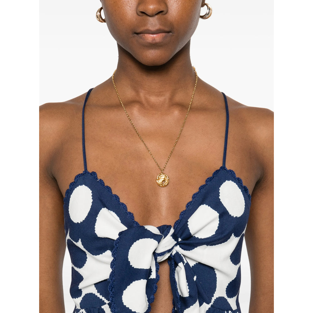 dark blue and white floral print tie front scalloped trim adjustable spaghetti straps