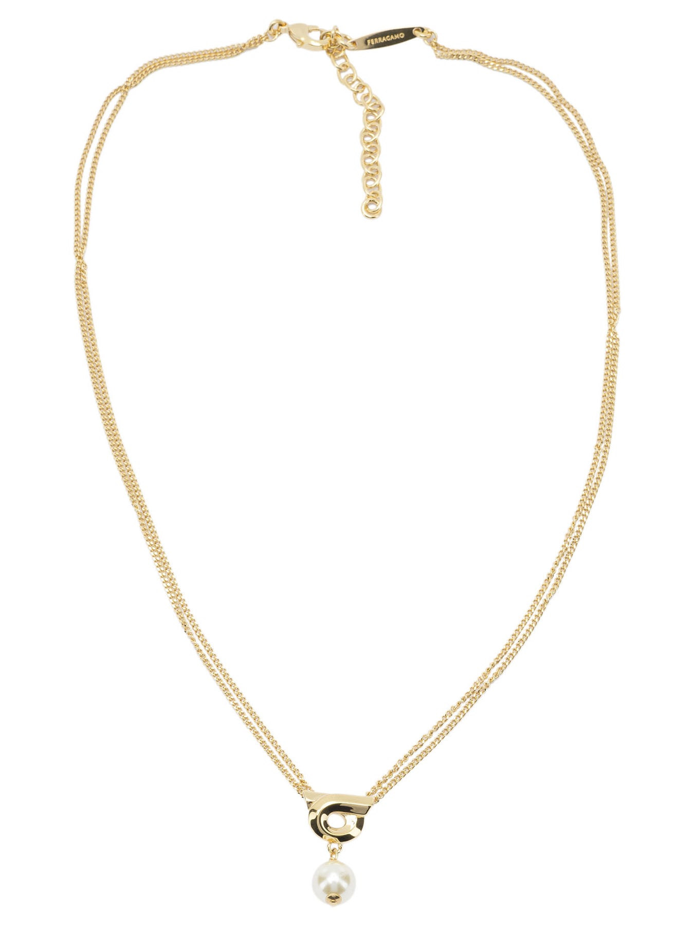"Gancini" necklace with Ferragamo pearl made of brass with polished finish. Structure composed of a double chain, Gancini pendant element and central pearl. The linear silhouette integrates rigid metal elements and connecting joints for adaptability to the shape of the neck. Weight is distributed between pendant and chain, overall volume is parallel to neck profile. Adjustable clasp for length adjustment. || - Gancini pendant with central pearl - Double brass chain - Adjustable length with lobster clasp closure - Weight balanced between pendant and chain - Necklace comes with original Ferragamo packaging