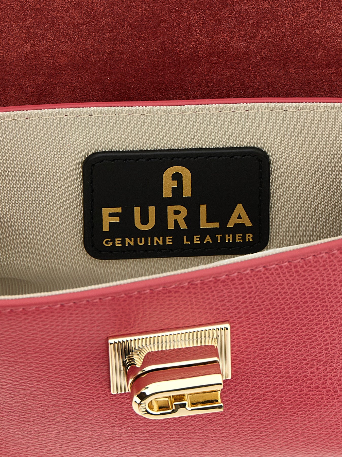'Furla 1927' mini crossbody bag in fine printed leather with a garnet texture, flap closure with metal spin with Arco logo, fixed handle, removable chain shoulder strap.