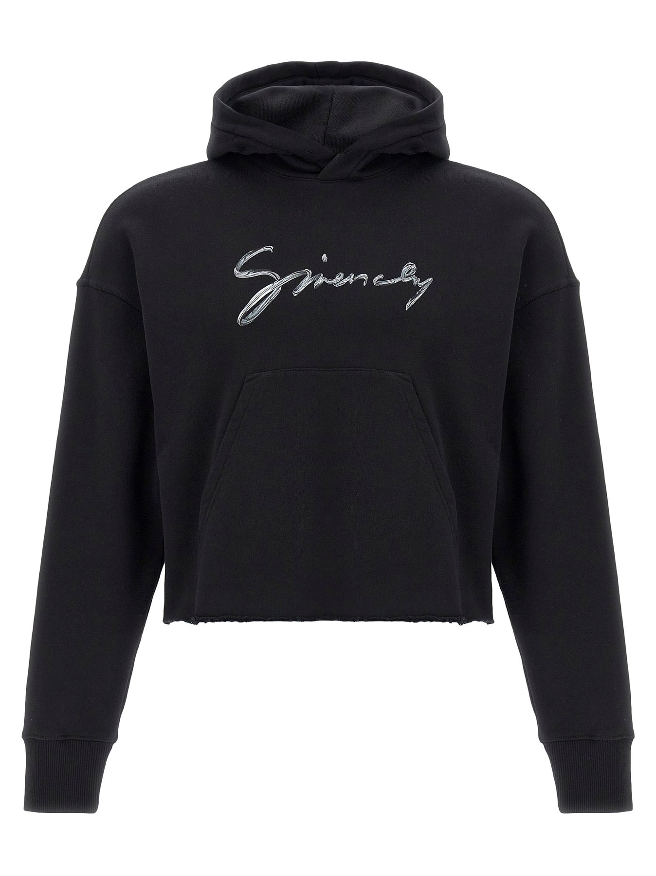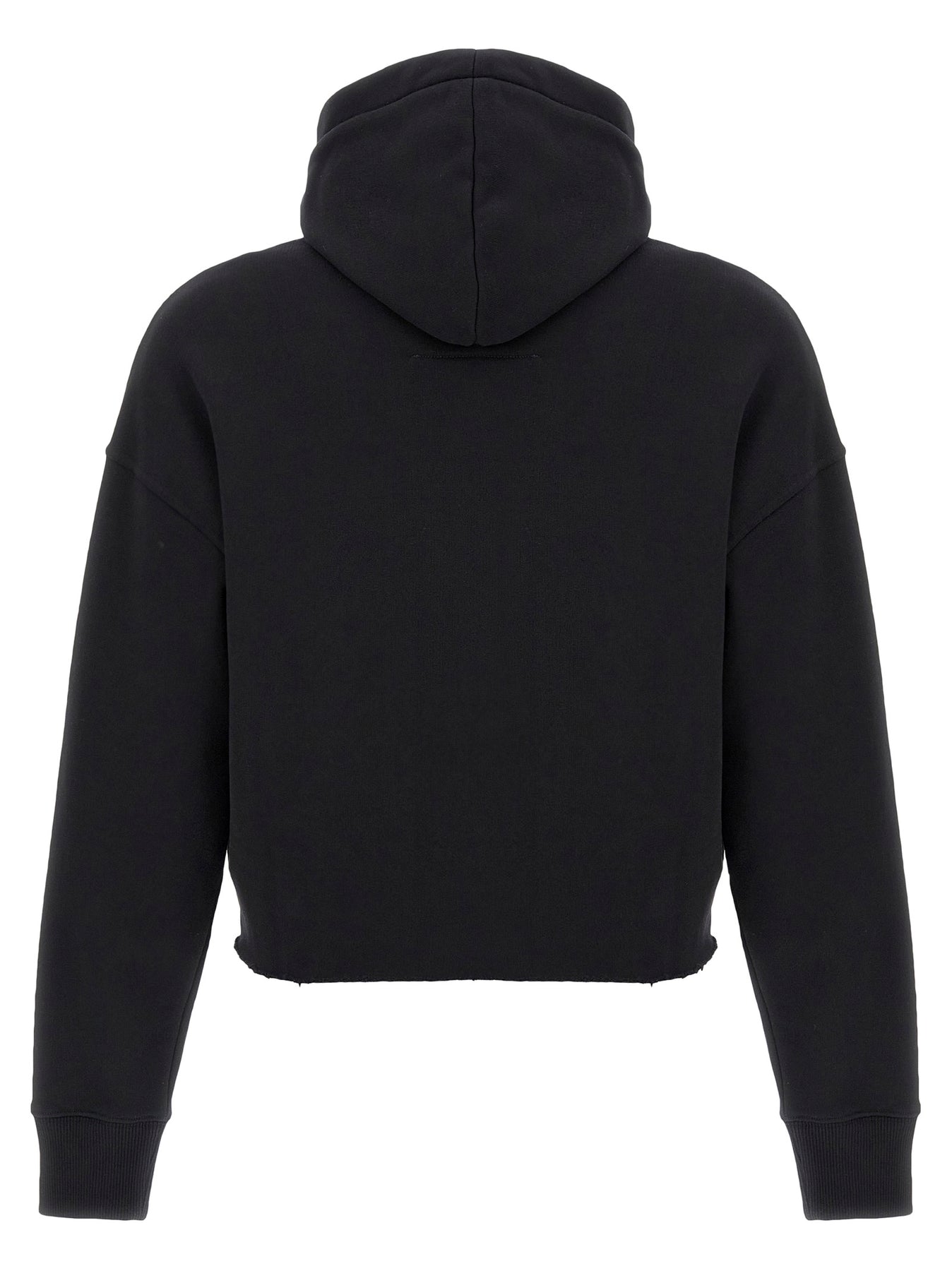 Brushed cotton hoodie, crop style with logo print and raw cut hem.