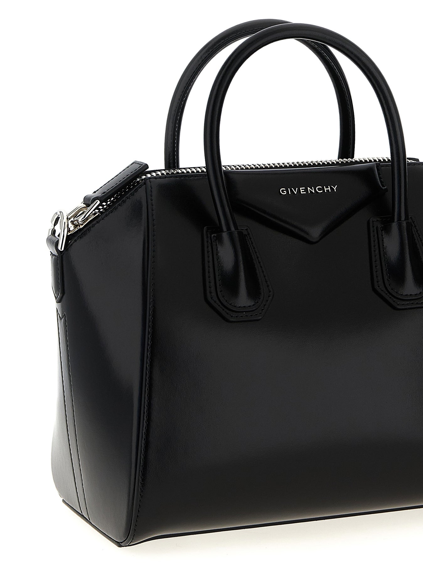 Givenchy iconic 'Antigona' small handbag in solid color 'Box' leather with silver hardware, leather handles and removable shoulder strap.