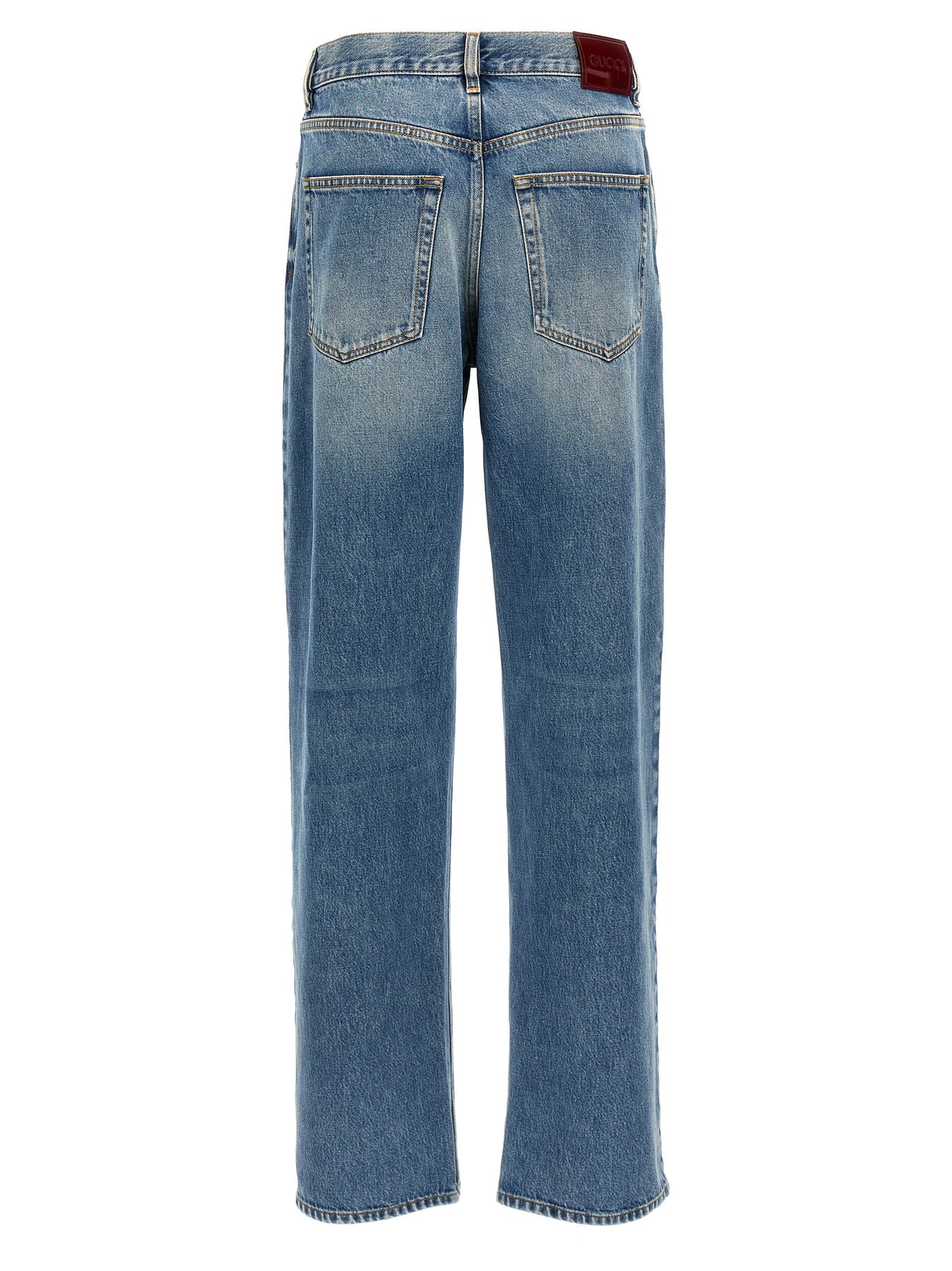 'Boyfriend' cotton denim jeans with mid waist with dropped crotch, slightly oversized fit, button closure, pockets, back logo tag.