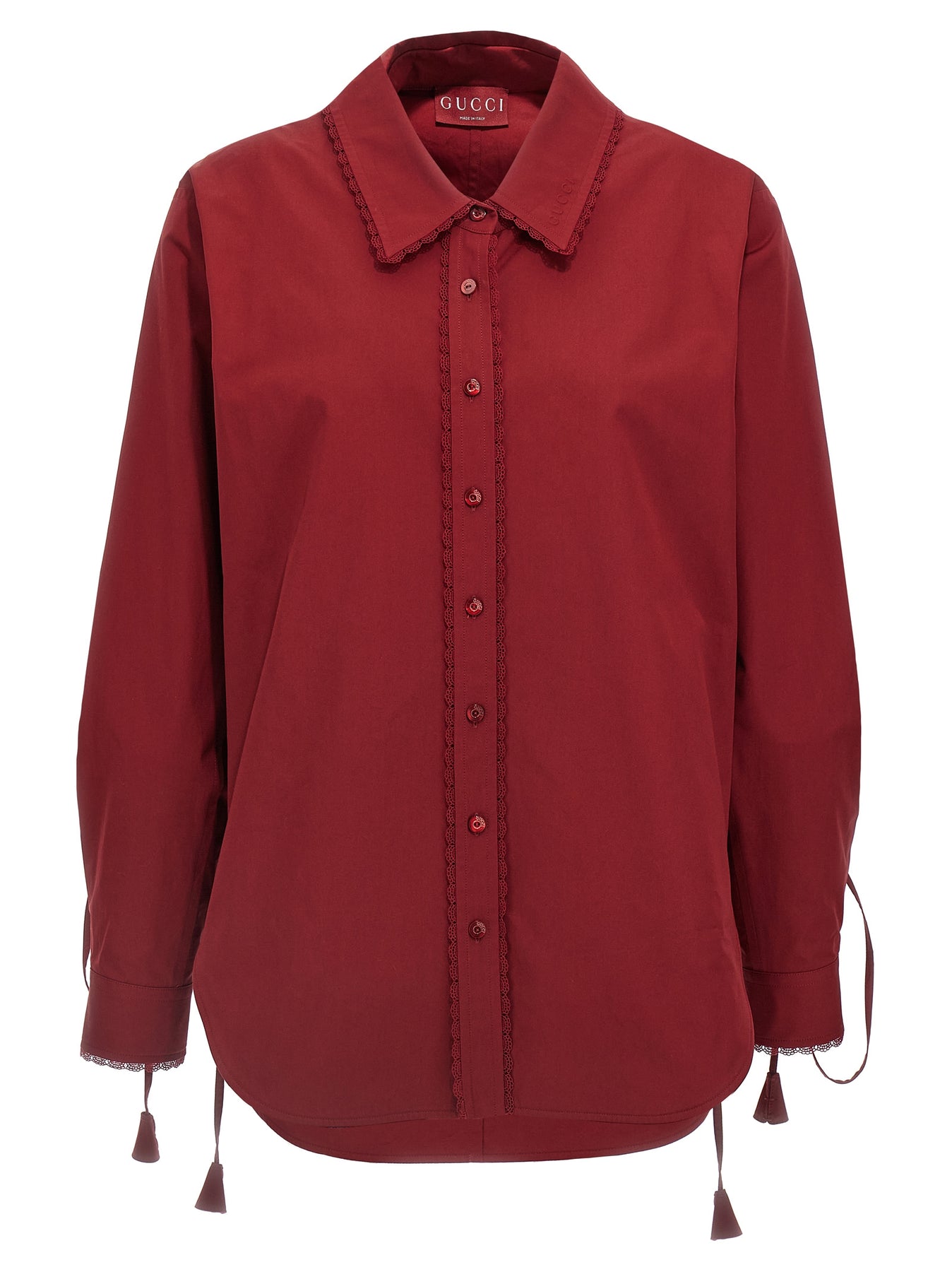 Heavy cotton poplin shirt, knotted lacing neckline, button closure, long cuffed sleeves and knotted laces.